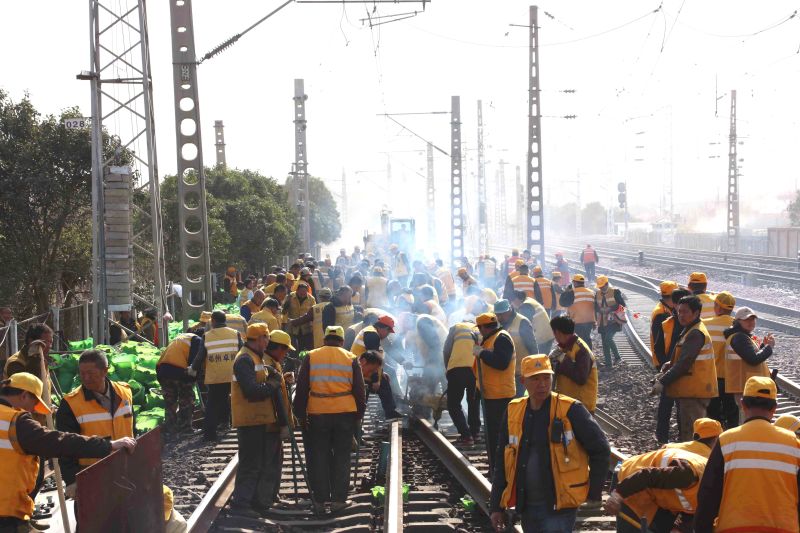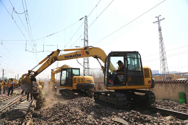 春季是铁路施工的黄金季节。3月25日,在陇海线铁炉车站,800多名施工人员经过200分钟的封锁施工,中国铁路郑州局集团有限公司郑州桥工段成功地对铁炉站“服役”到期的11号、21号道岔进行更换,线路于中午12时40分准时开通。