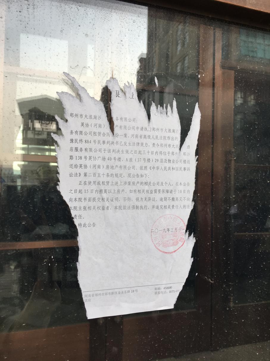 河南省高院2018年11月23日出具的民事判决书,详细记载了背后的故事:2011年4月18日,英协(河南)房地产有限公司(以下简称“英协公司”)与郑州市大浪淘沙酒店服务有限公司(以下简称“大浪淘沙公司”)签订《房屋租赁合同》,约定英协公司出租英协广场40号楼给大浪淘沙,租期15年,租金第一个五年,每平米每月50元,随后每五年单价递增5元。此外,大浪淘沙还租了37号楼29层及物业楼,每年租金各30万。