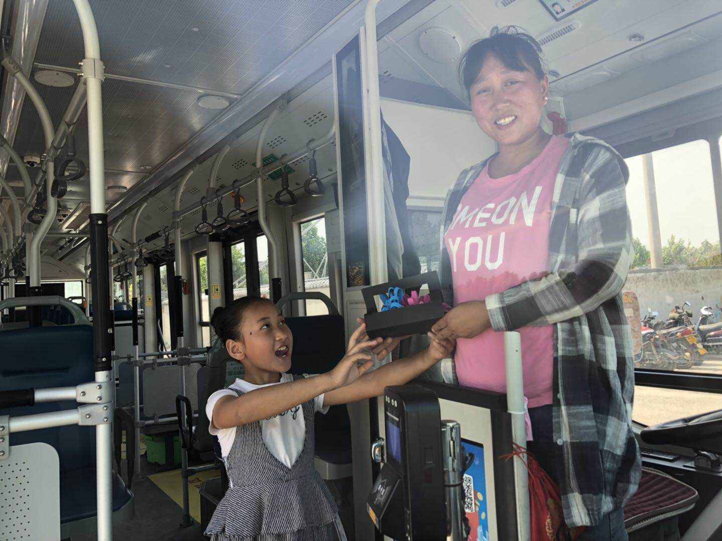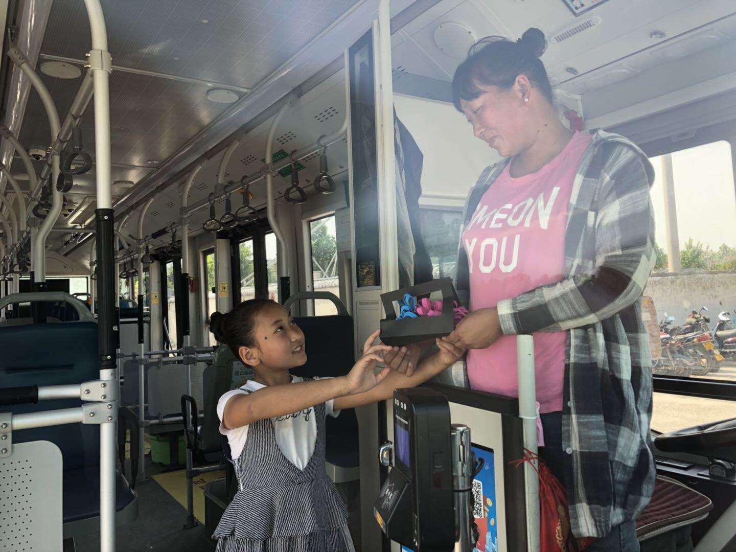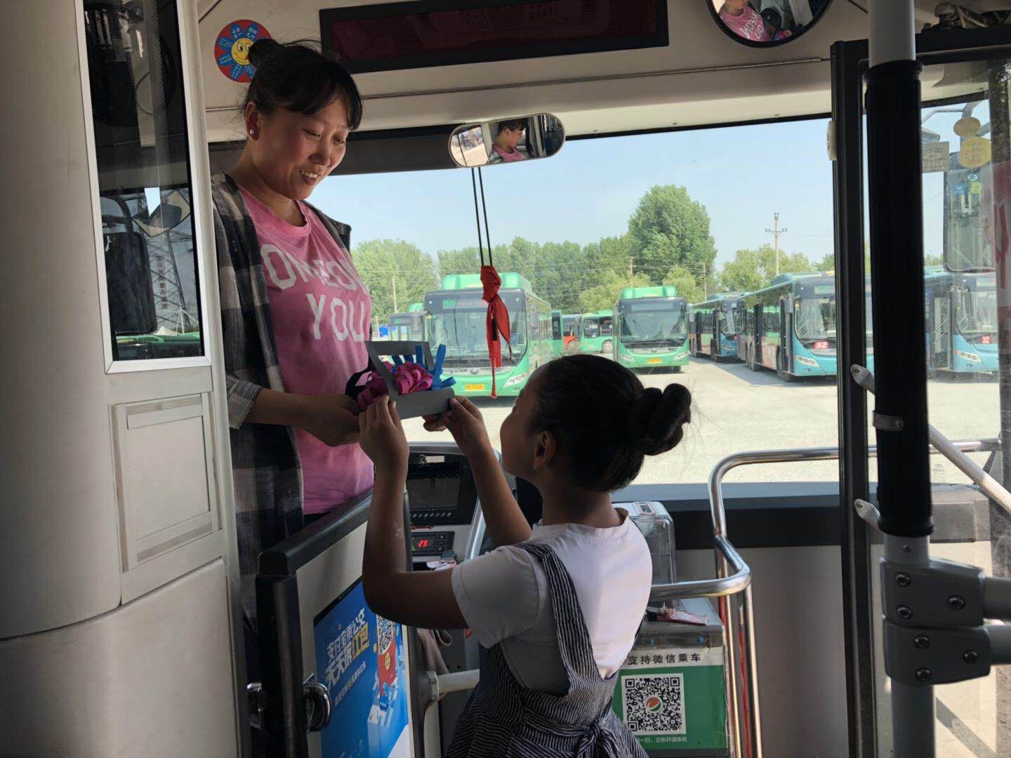 5月11日下午3时许,公交车长郭书引像往常一样跑完一趟车回到花园口村公交场站,突然看见厂区门口自己的女儿站在厂区门口不停地向外张望,手里好像还藏着什么东西一样,似乎在等待着什么,当孩子看见自己的车时,飞奔着向自己跑来,这突如其来的状况让郭书引愣住了,急忙把车停稳,打开前门,这时女儿飞快的跑上车,把手里的东西递到妈妈面前,郭书引一看,原来是女儿自己做的手工花。