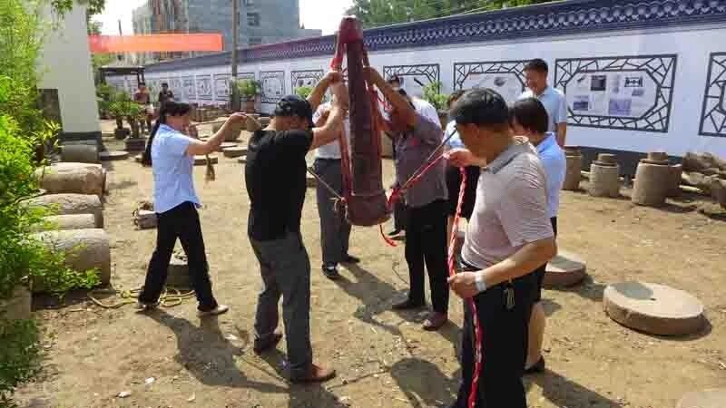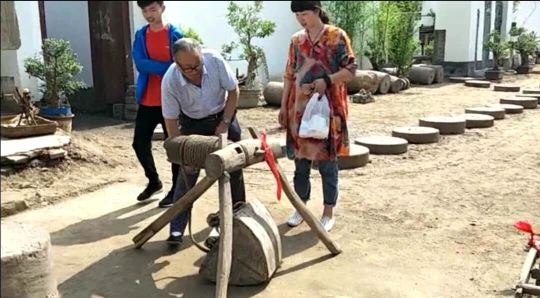 活动中,参观体验的10多人共同抬起了石夯,体验当时农耕时代打平地面时的辛劳。