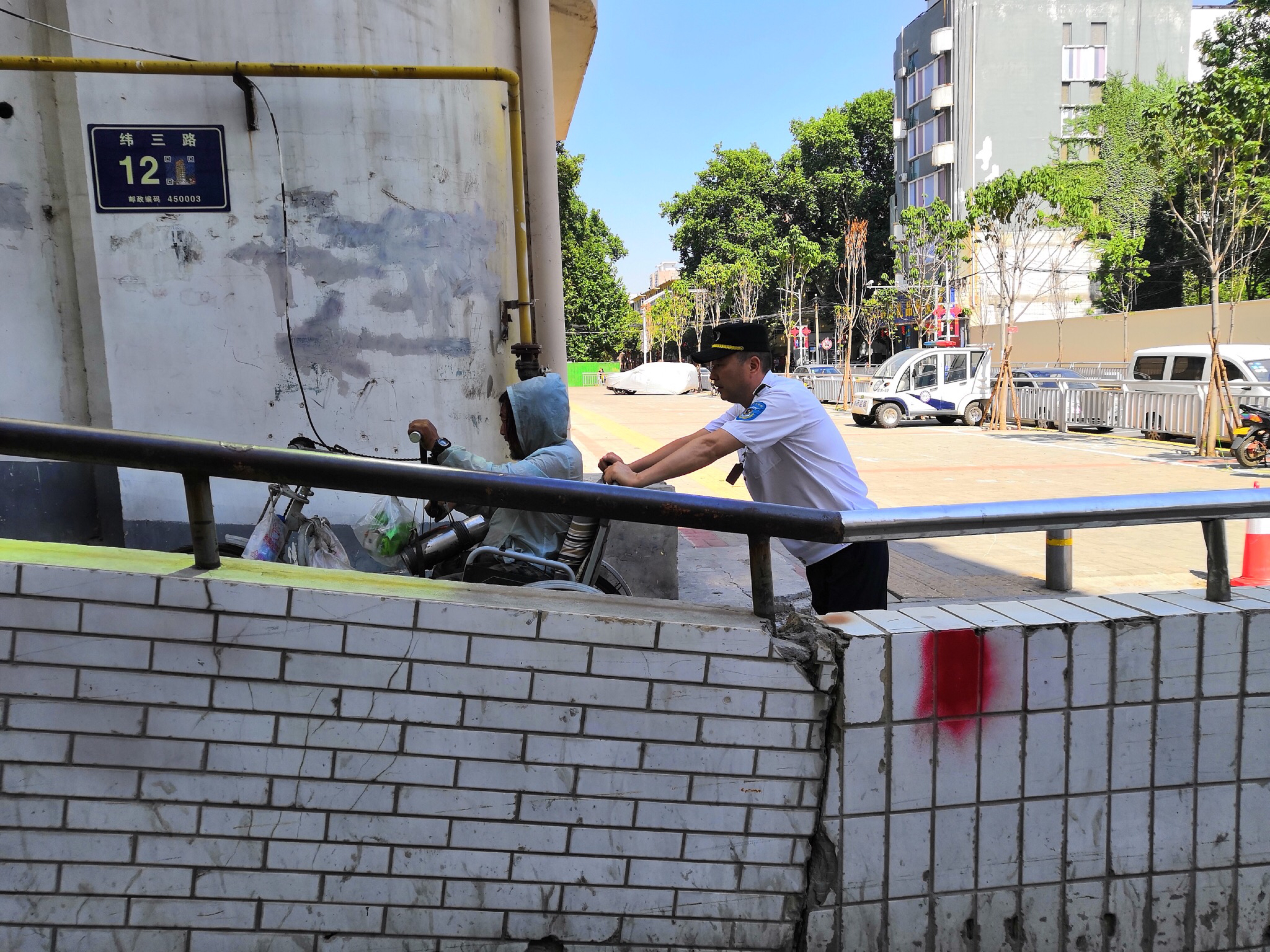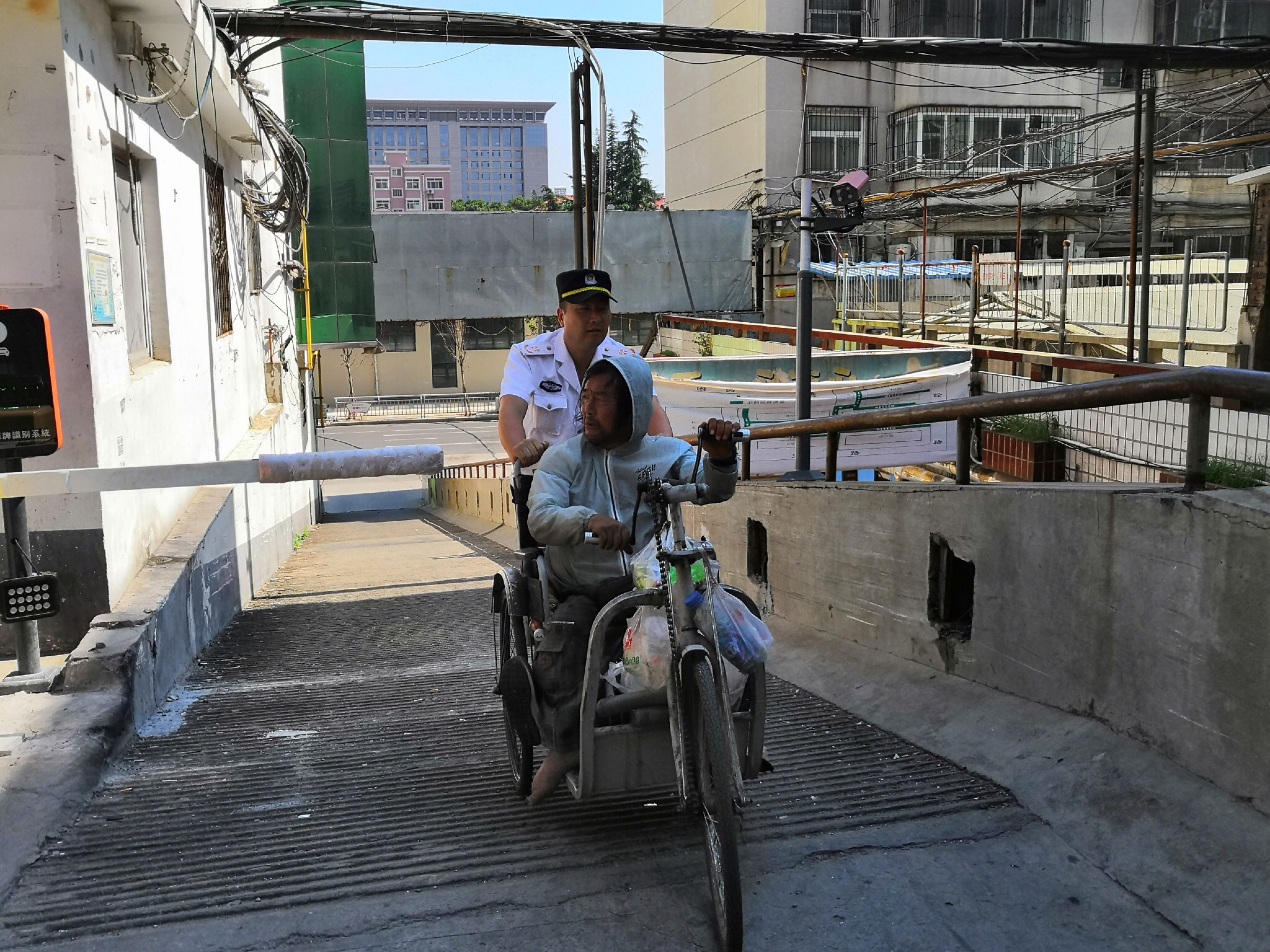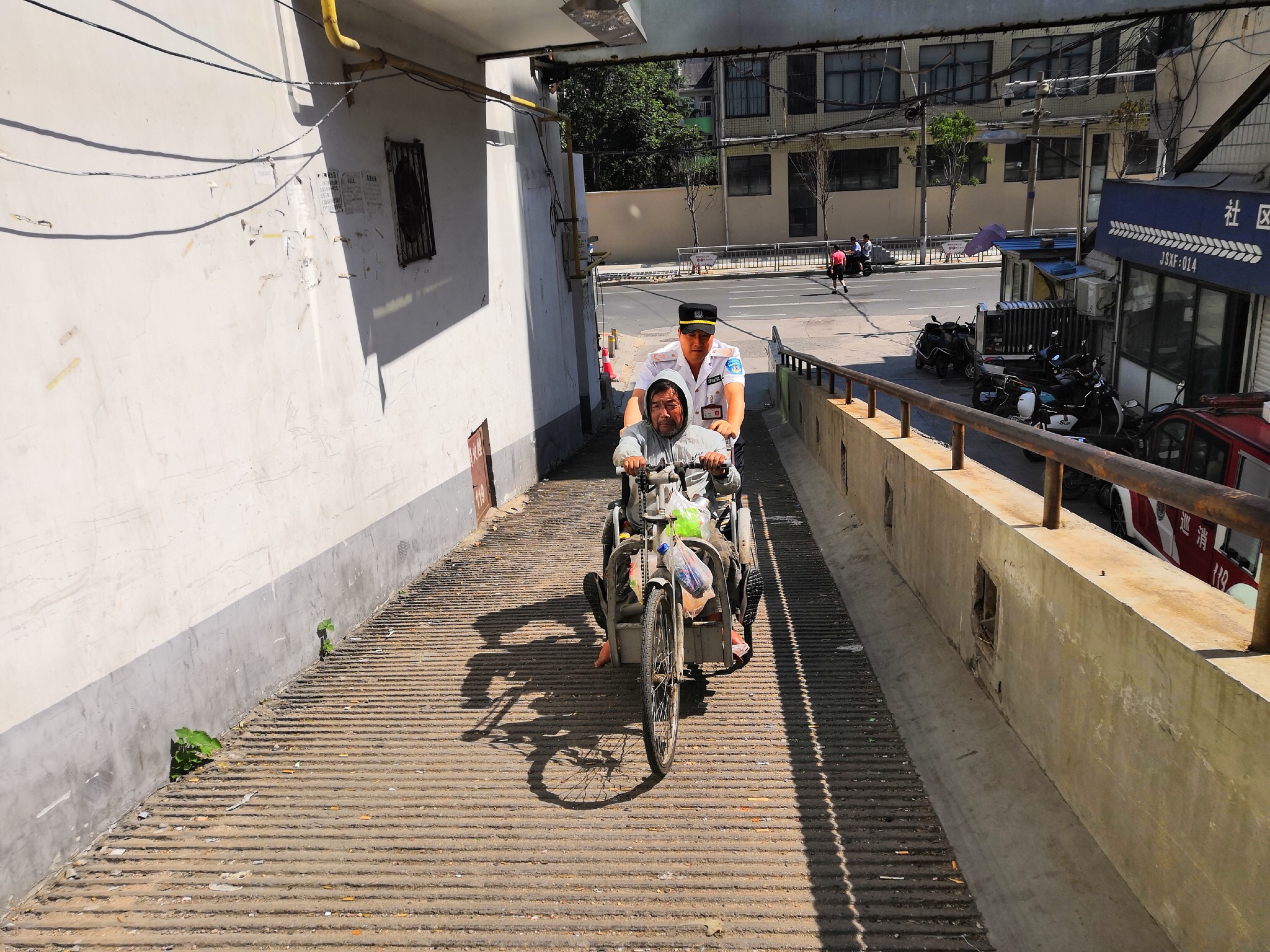 7月12日上午8时30分左右,一名住在楼上的高位截瘫残疾人朋友,摇着轮椅想爬坡上楼。然而,他用力摇着轮椅上行了五六米后,轮椅就开始向下倒退,他再次尝试也是无功而返。正在焦急无助之时,金水区经八路办事处的巡防队员张卫国、王鑫巡逻到此。张卫国看到从坡上退下来的轮椅后,赶紧跑过去从后面挡住轮椅下滑,然后推着轮椅车上坡。