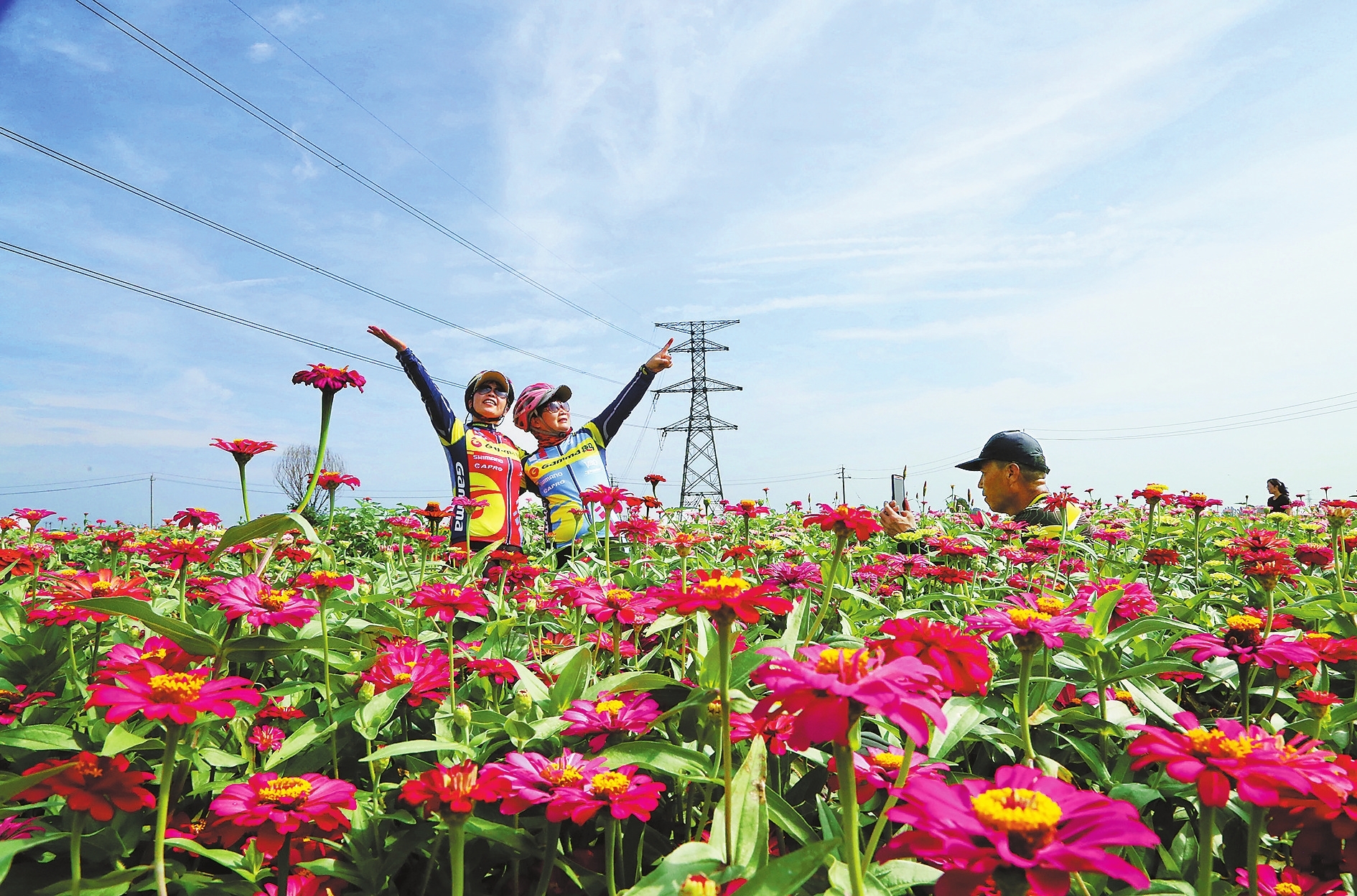 7月23日,市民在宝丰周庄镇马起营花海游玩。该镇从2019年春开始在湛河源头马起营村规划设计种植食用玫瑰、百日菊等数十个品种的花卉,打造花海世界。美丽花海不但促进了当地乡村游的火热发展,也使人居环境得到极大提升和改善。王双正摄