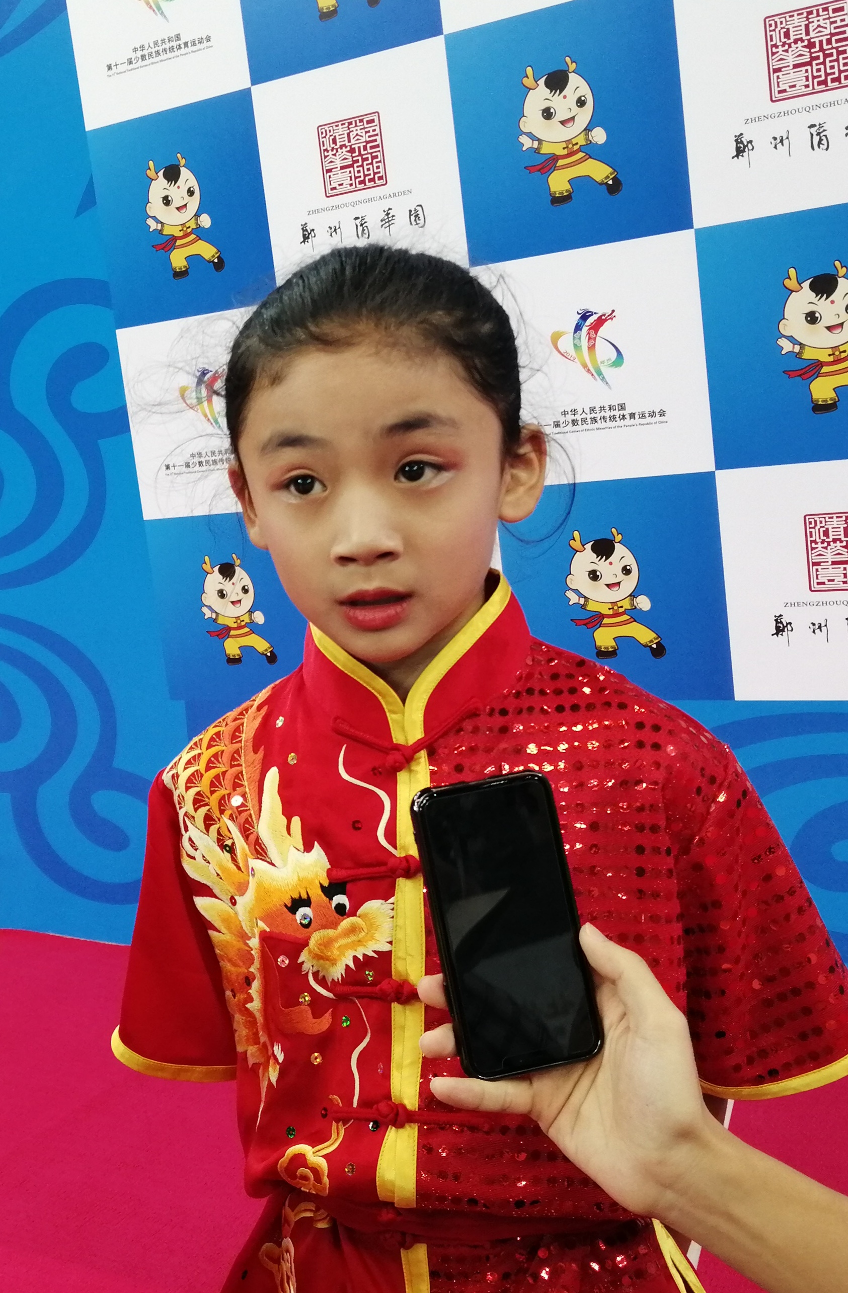 作为民族武术项目年龄最小的参赛选手,新疆生产建设兵团代表队的陈佳慧的另一个身份,则是九岁的一名三年级小学生。然而比赛场地上的她,把三节棍挥舞得满场叫好,但也有一些观众替她捏了一把汗。 “三节棍在你的身体四周摆动,看着很危险,你难道不怕吗?”且听听陈佳慧是咋样回答的,她说,教练让她来参加比赛,就是要专门练练她的胆量。那怎样克服紧张和恐慌心理呢?她说,把三节棍想象成橘子、水果、酸奶、牛奶,然后一点就不怕了。作为维吾尔族的一名代表,她也希望自己在到场观看的家人和民族同胞面前展现出自己最好的一面。 相比较其他三个项目,男子传统双器械赛场上的比拼,可以用“惨烈”一词来形容,这主要体现在选手分数的接近上。其中,湖北代表队选手、北京代表队选手均获得了9.48分的高分。陕西代表队选手更是获得9.49分,而天津代表队的张鸿皓,以9.50分的最高分获得该项目的一等奖。