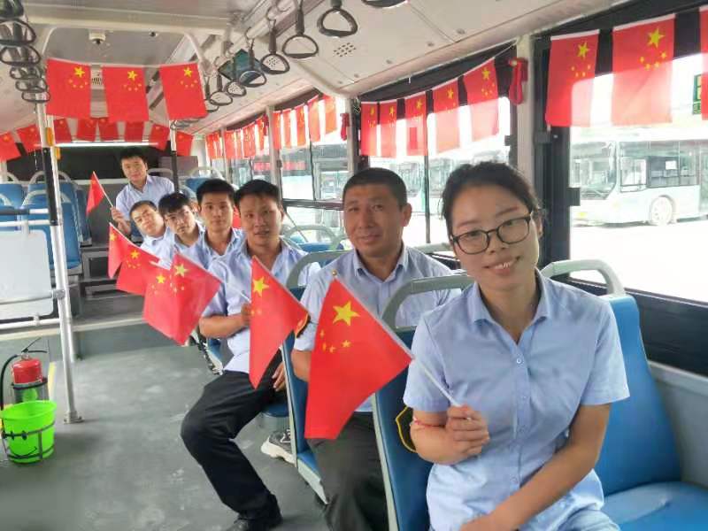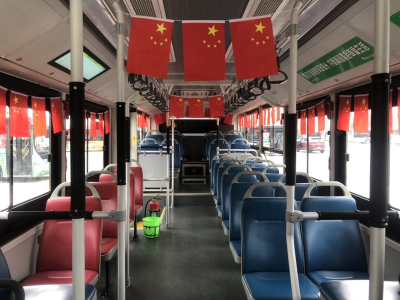 党员车长王涛说:在新中国即将迎来70岁生日的日子,装扮这个国旗主题车厢的目的就是希望把爱国主义教育搬进车厢,激发人们的爱国情怀,让国旗和公交车一同穿梭在城市的各个角落。随着车辆的行驶,一面面五星红旗迎风飘扬,显得既庄重又喜庆,每当看到五星红旗,心里就有一种自豪感,这样可以让更多的乘客感受浓郁的国庆氛围,向祖国献礼。