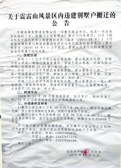 11月3日,信阳市平桥区人民政府下发《关于震雷山风景区内违建别墅户搬迁的公告》。记者从公告中获悉,平桥区人民政府将依法依规对震雷山风景区内的违建别墅进行没收。
