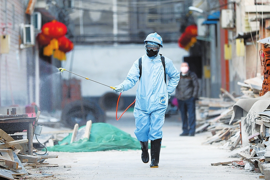 2月3日,温县蓝天救援队党员志愿者在居民小区进行消毒。徐宏星摄