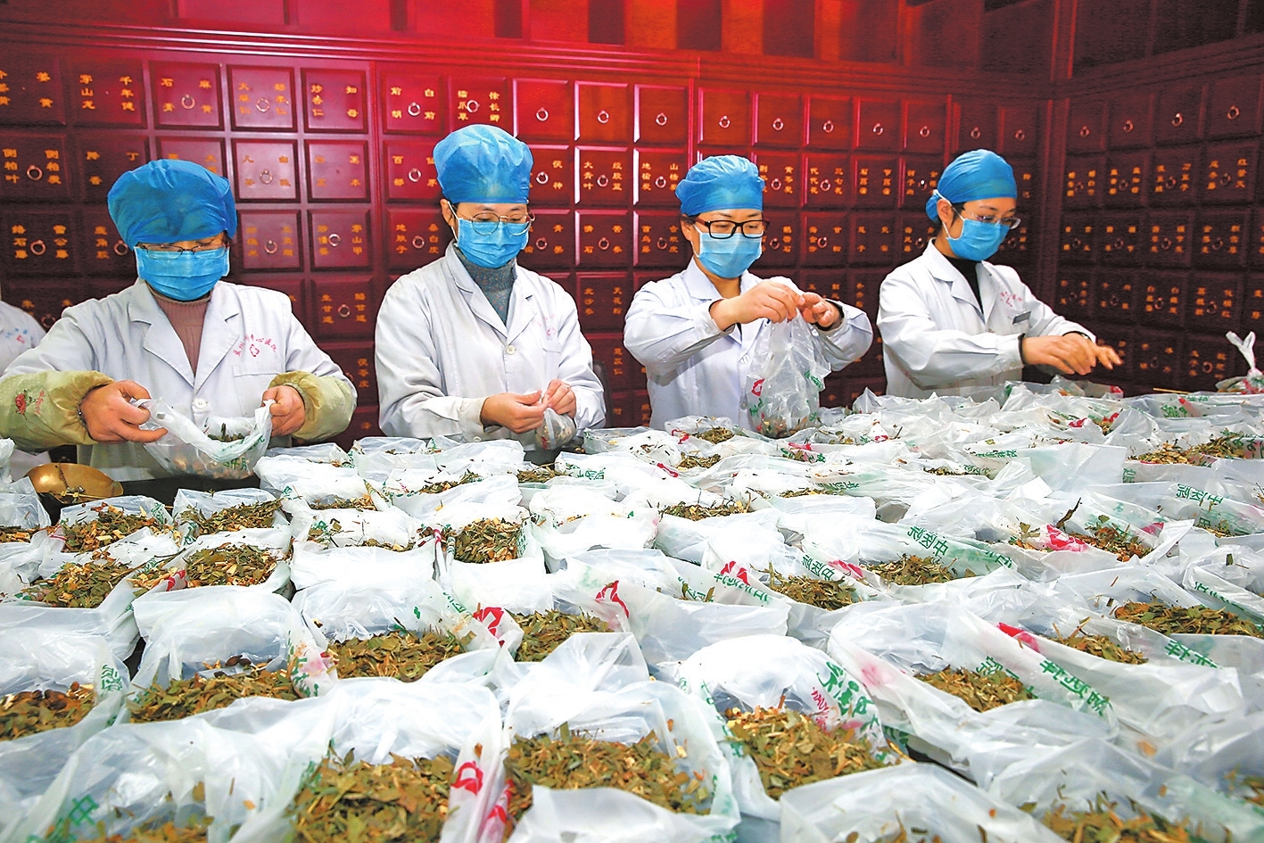 2月12日,孟州市中医院医务人员在包装中药材。为了助力抗击疫情,该院每天配制中药2000余份,送给抗击疫情第一线的医务人员和防疫人员。王中贺 摄