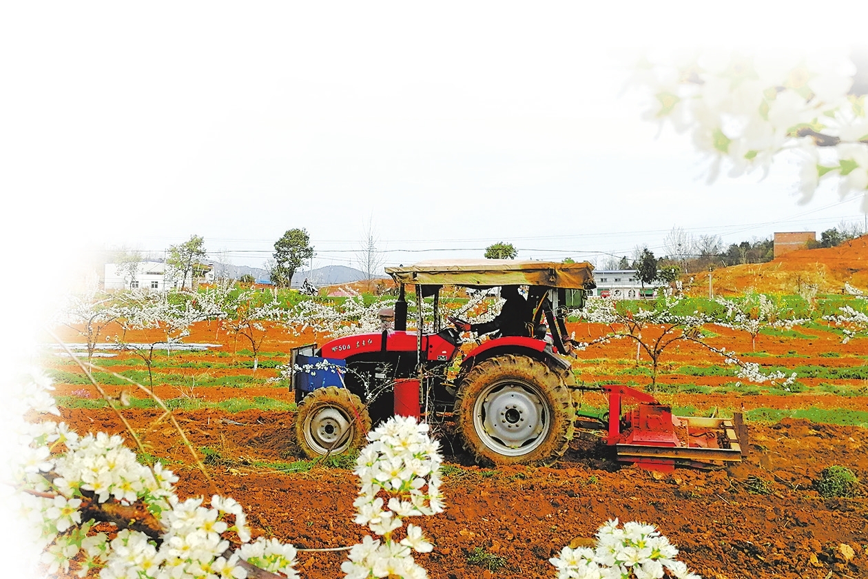 3月17日,在淅川县老城镇王岭村杏李果园,村民正在使用农机松土春播,为新一年的丰收打基础,促进增收。杨冰摄
