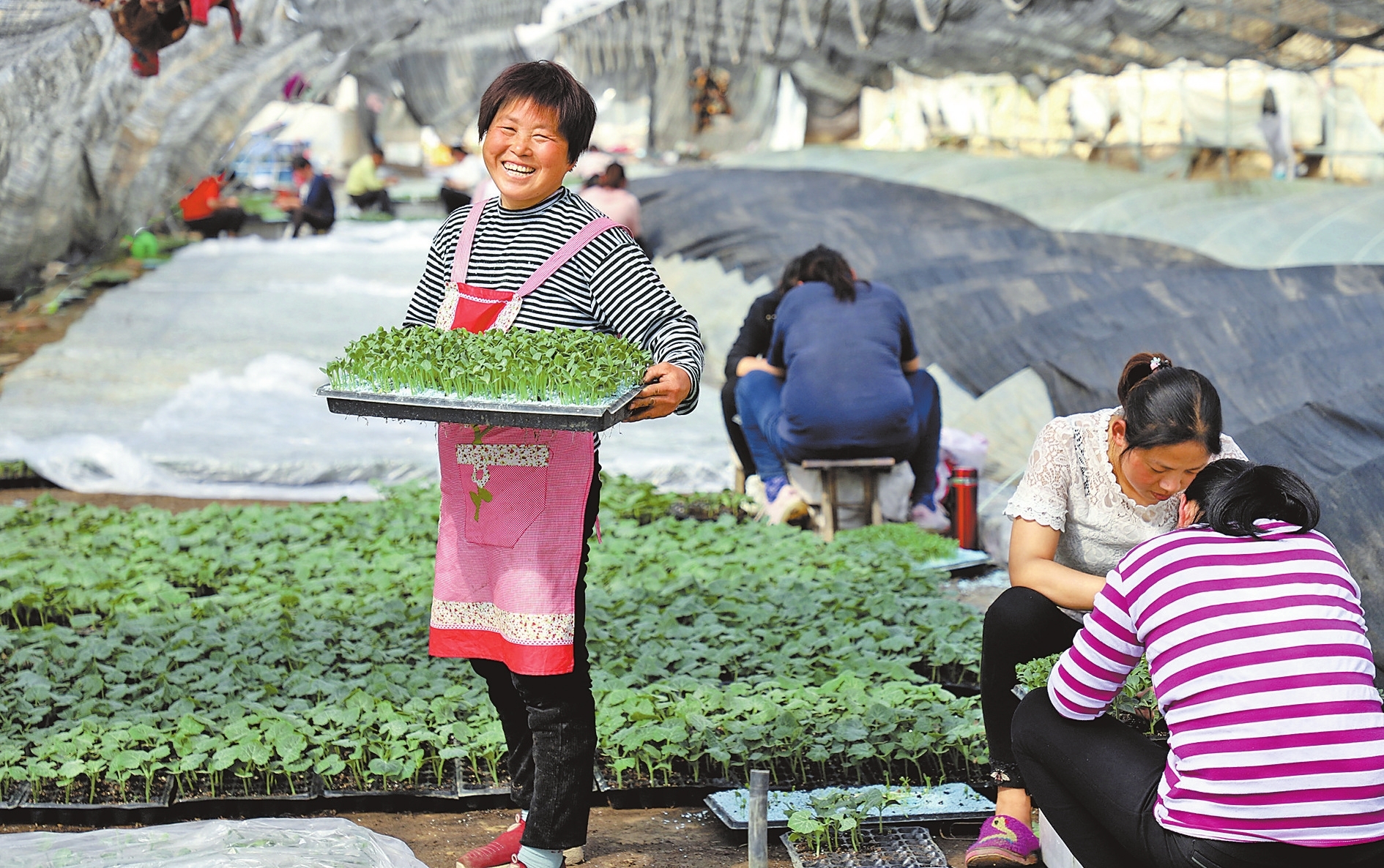 3月17日,民权县野岗镇芒岗村村民在位于本村的“三收”家庭农场的温室大棚内嫁接西瓜苗。马玉摄