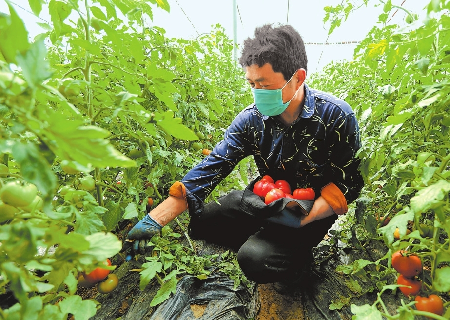3月18日,中牟县韩寺镇东岗村村民在大棚打理即将上市的西红柿。该镇一边全力做好防疫工作,一边积极恢复春耕生产,确保防疫生产两不误。本报记者邓放摄
