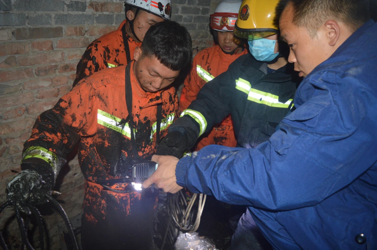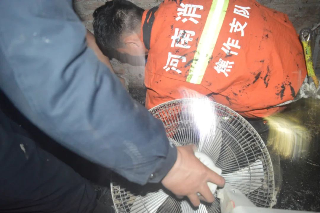 但由于池口较窄,救援人员背负空气呼吸器无法进入。随后,现场救援人员借助风扇往池内送风,增进空气流通。