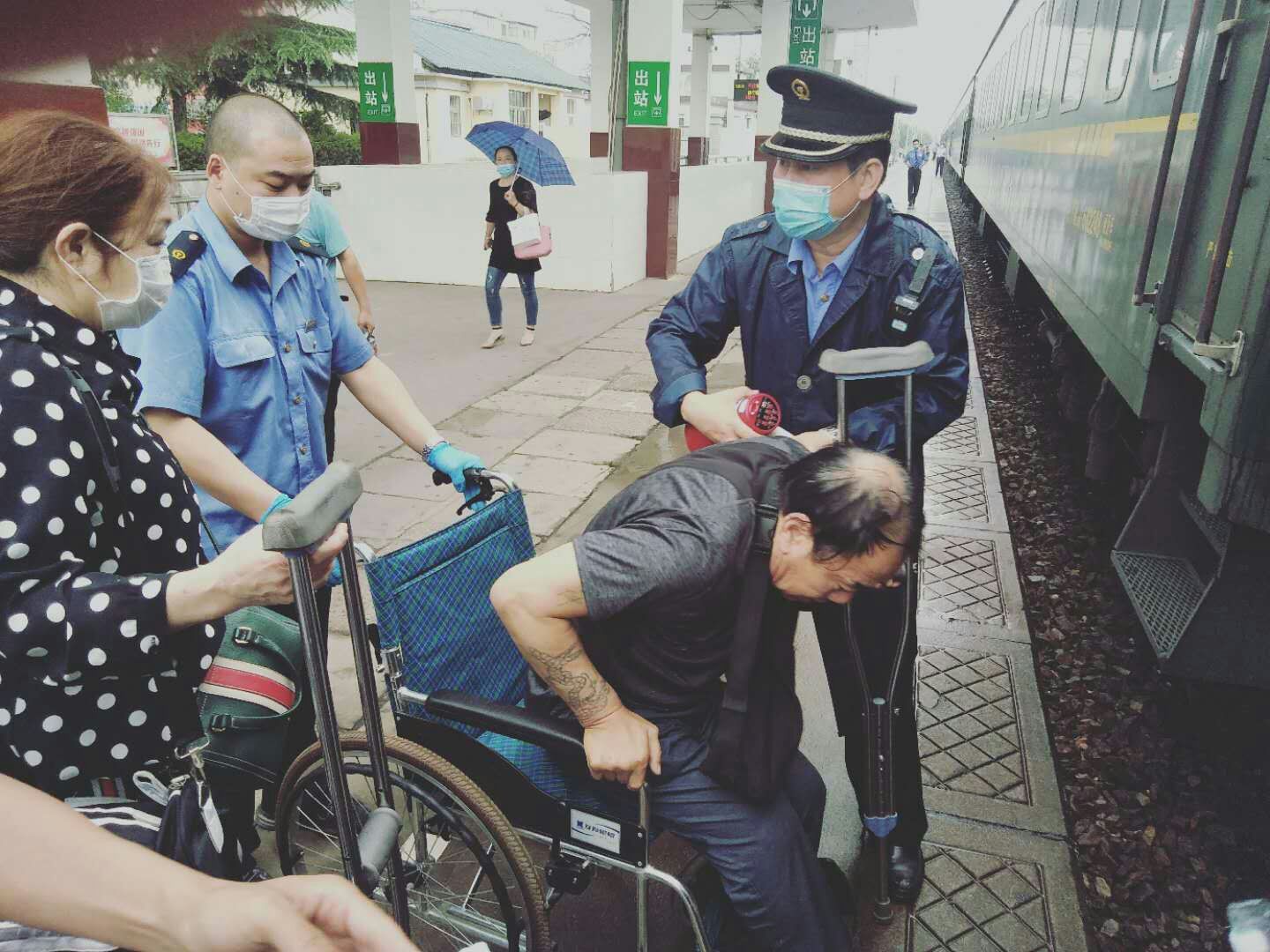 k608次列车到达后,他们立即上车将患者搀扶到站台等候的轮椅上,客运员张文推着他从该站为其开辟的“绿色通道”出行。
