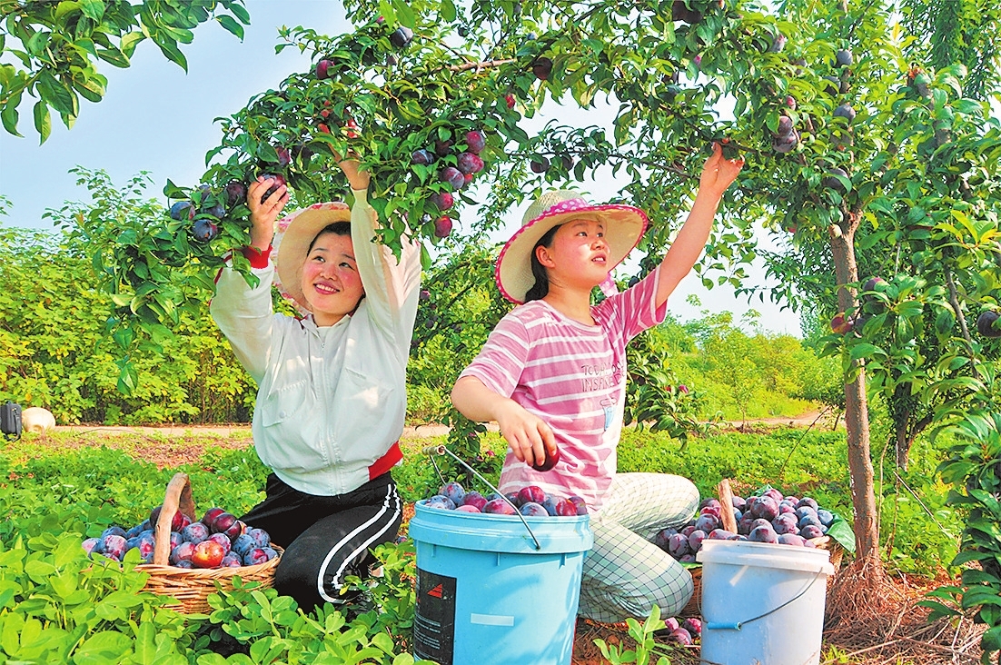 图①游客在淅川县老城镇叶沟村生态果园采摘杏李。杨冰摄