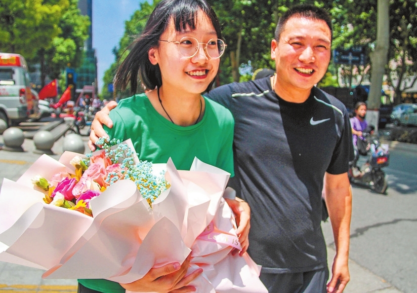 7月7日上午,南阳市第二中学考点外,一位考生接过父亲送来的鲜花。高嵩摄