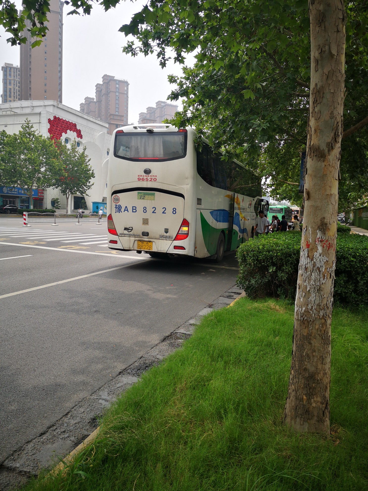 一辆车牌号为豫Q25019的大巴客运车停在了路边,乘客争先恐后上车。