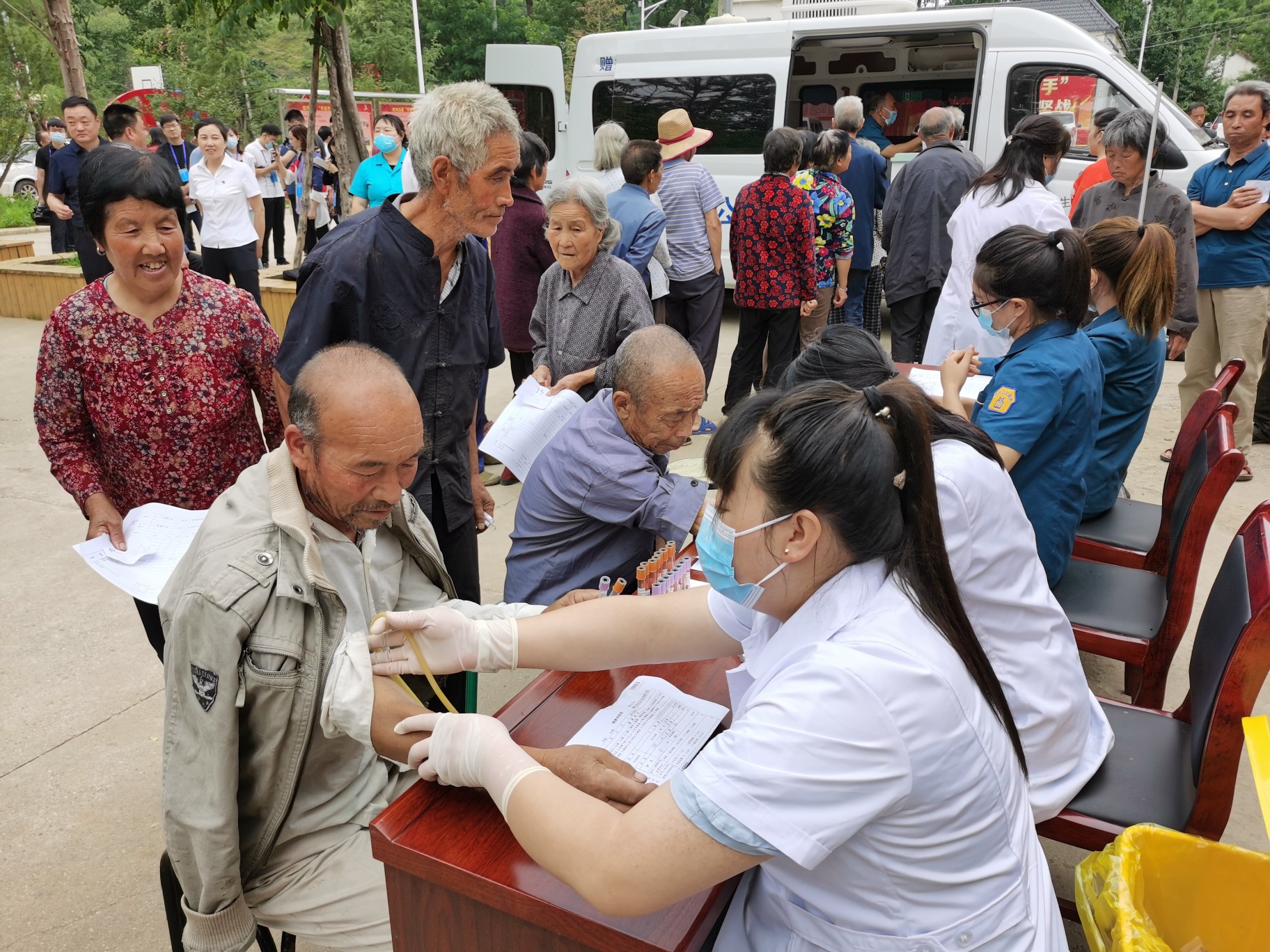 而在显众村的文化广场上,姚长友已经排到了检测视力的环节,今天他还将进行尿检、心电图等一系列检测,从而形成他自己的数据库。
