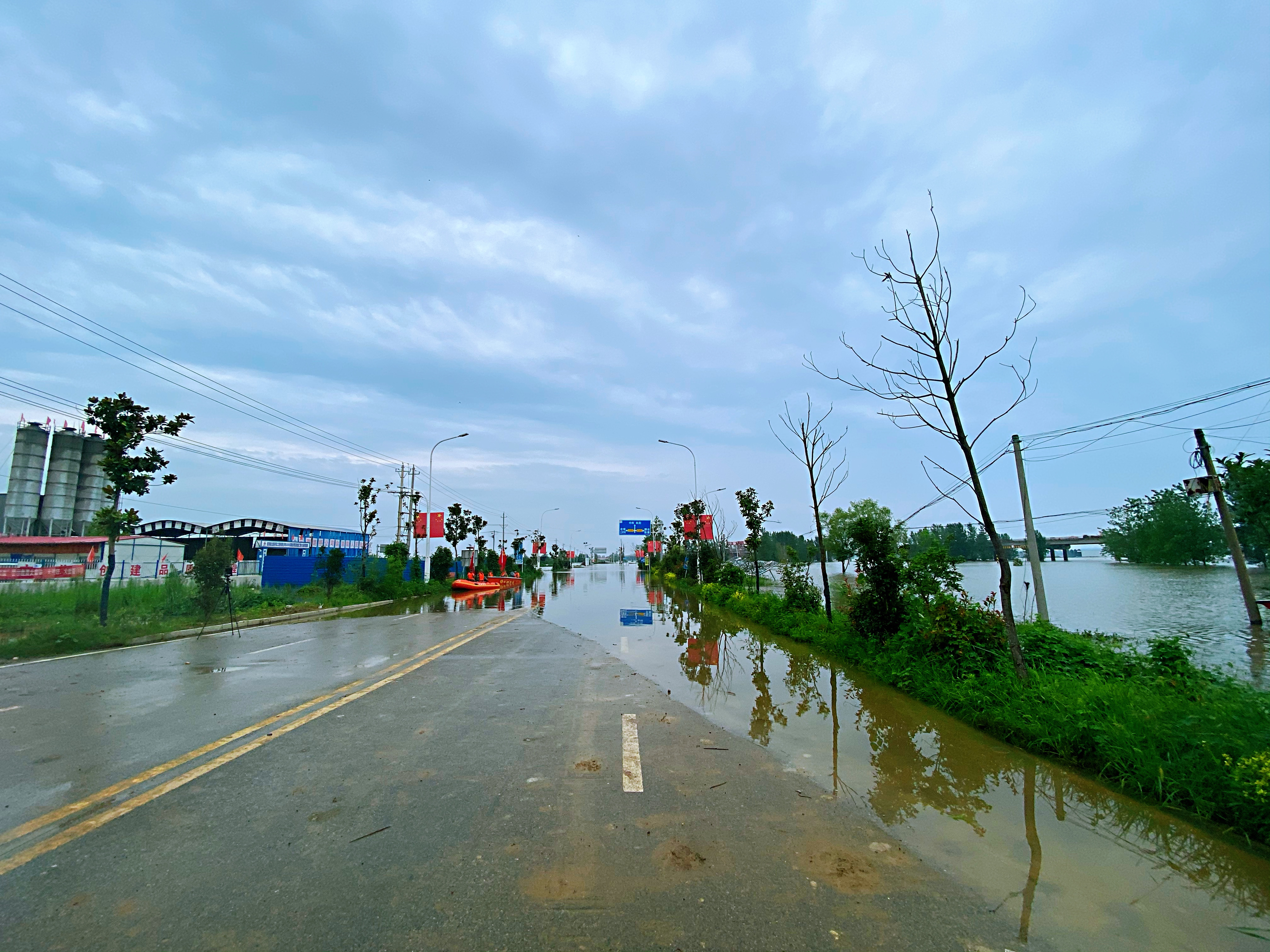 阜南县曹集镇在蒙洼蓄洪区内,下泄的洪水已将这个镇所在的高地三面包围,仅剩一条通往淮河大堤的路供通行。