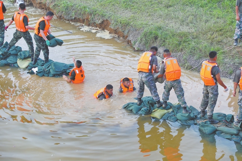 为了开辟用于向船只上运送沙袋的通道,部队官兵们直接跳进河道,一条人工“传送带”很快形成。