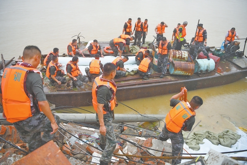 运沙石、填沙袋、搬木棍、做沙笼……部队官兵们争分夺秒工作,通过船只将堵塞管涌的物品一批批运送到河面、一样样抛下水,试图阻止管涌进一步扩大。