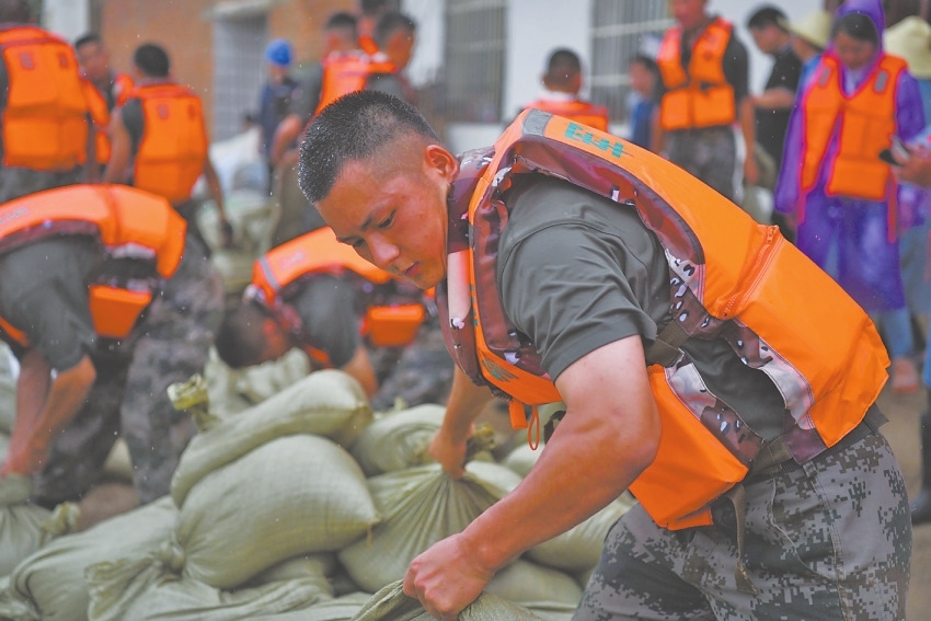 大河报·大河客户端记者在现场看到,部队官兵们一个个浑身湿透,撑袋的撑袋,挥锹的挥锹,一车车沙石料和编织袋运来,很快就变成了小山似的沙包堆。