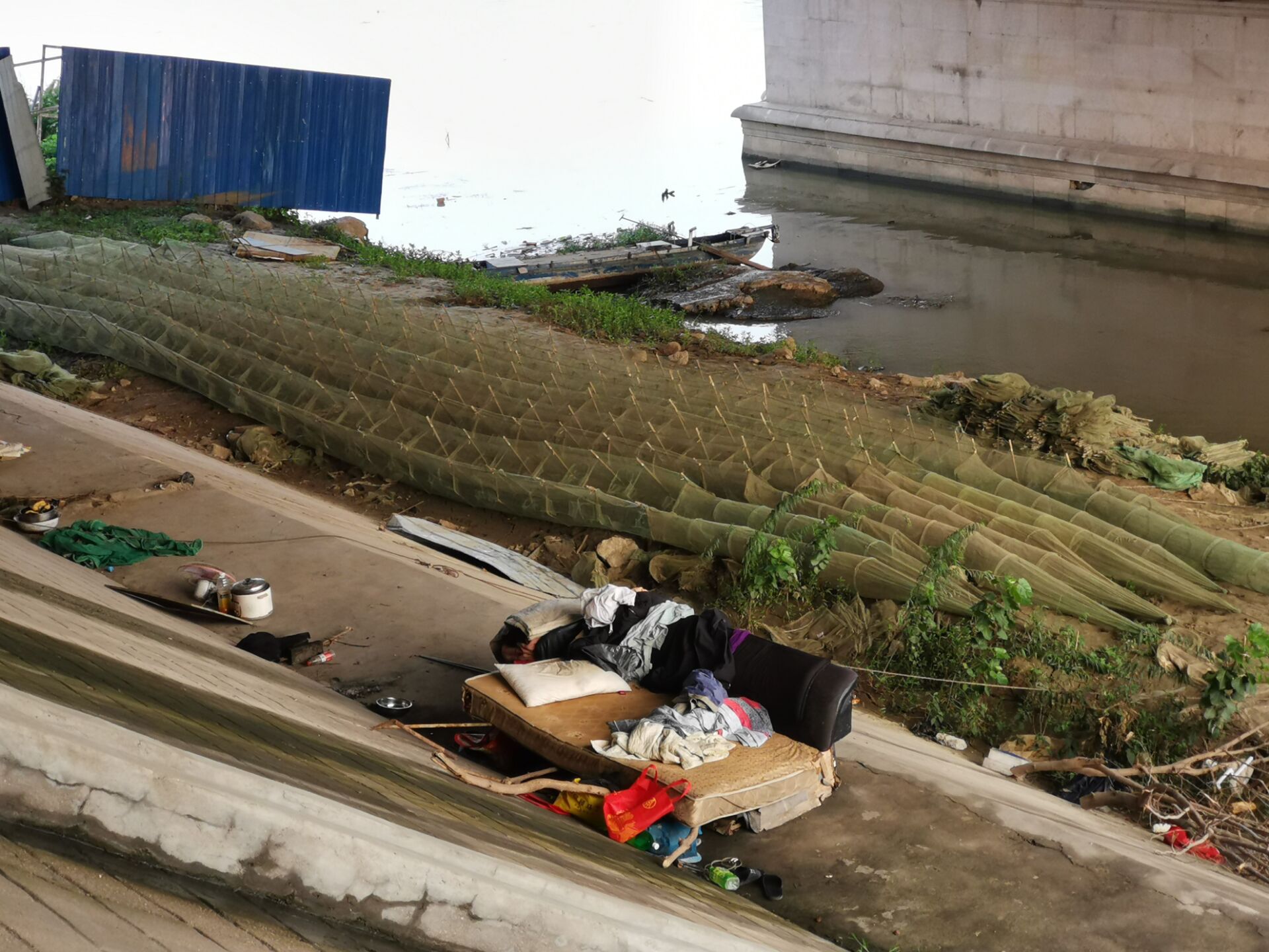 8月12日傍晚时分,在知情人的带领下,大河报•大河客户端记者首先来到沙颍河周口八一路大桥下。在这里,记者目睹了两名捕鱼者下地笼渔网的全过程,只见他们在桥头下网之后,划船向东驶去。在他们离开后,记者悄悄翻过障碍物,来到他们的“根据地”,眼前的一幕令人震惊:10多条正在晾晒的地笼以及几十条叠在一起的地笼被摆放在那里,俨然成了一个“地笼仓库”。旁边,有床铺、电饭锅等生活用品,知情人说,这些捕鱼者不分昼夜使用地笼捕鱼,收网之后第二天赶早市售卖。