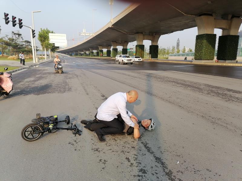 几分钟后,见这名男子情况有所好转,常运好慢慢地将其扶起,又将倒地的电动车扶起。
