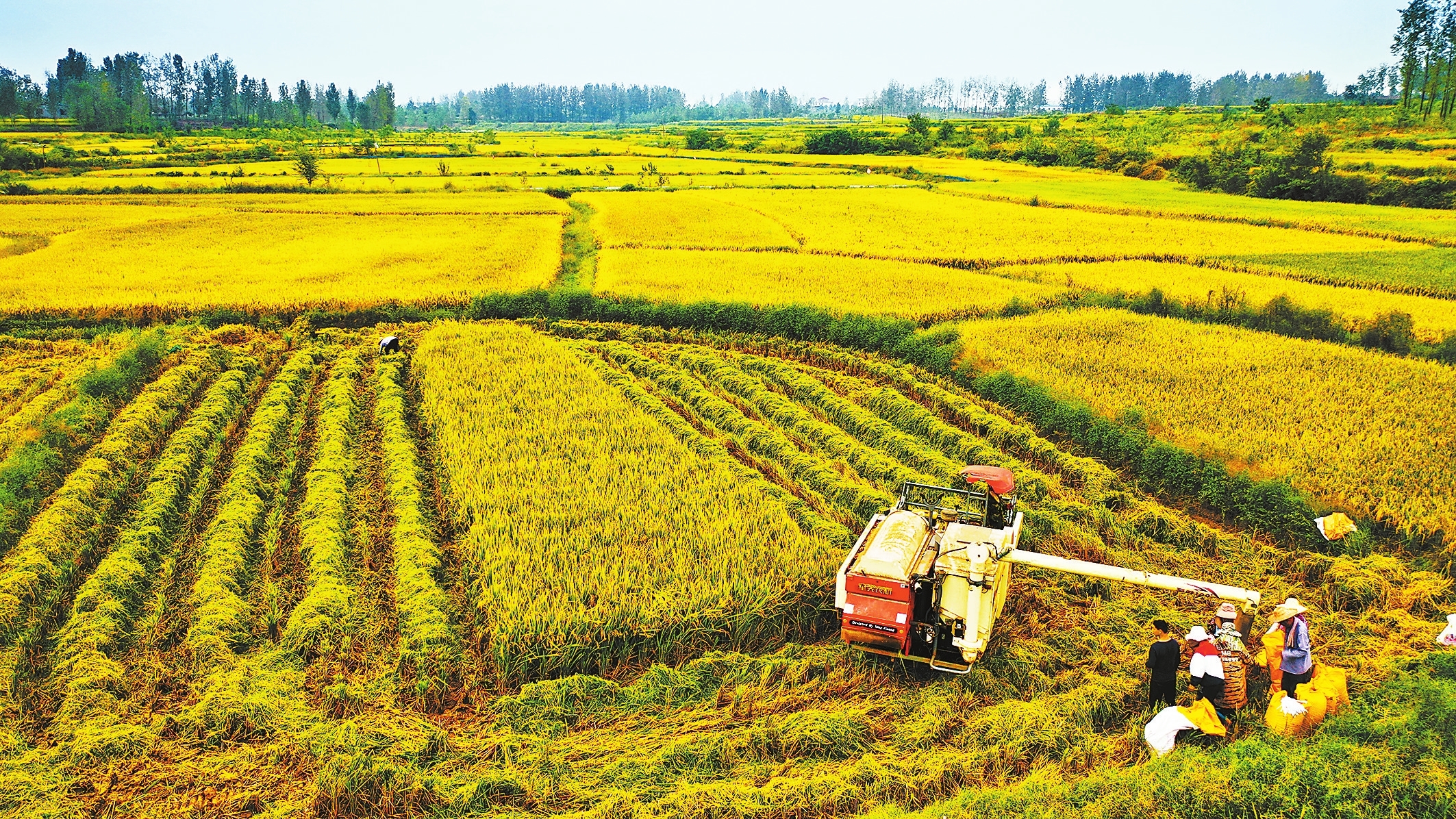 9月10日,固始县杨集乡北店村大地金黄,农民正在抓紧时机机收水稻,确保颗粒归仓。本报记者聂冬晗摄
