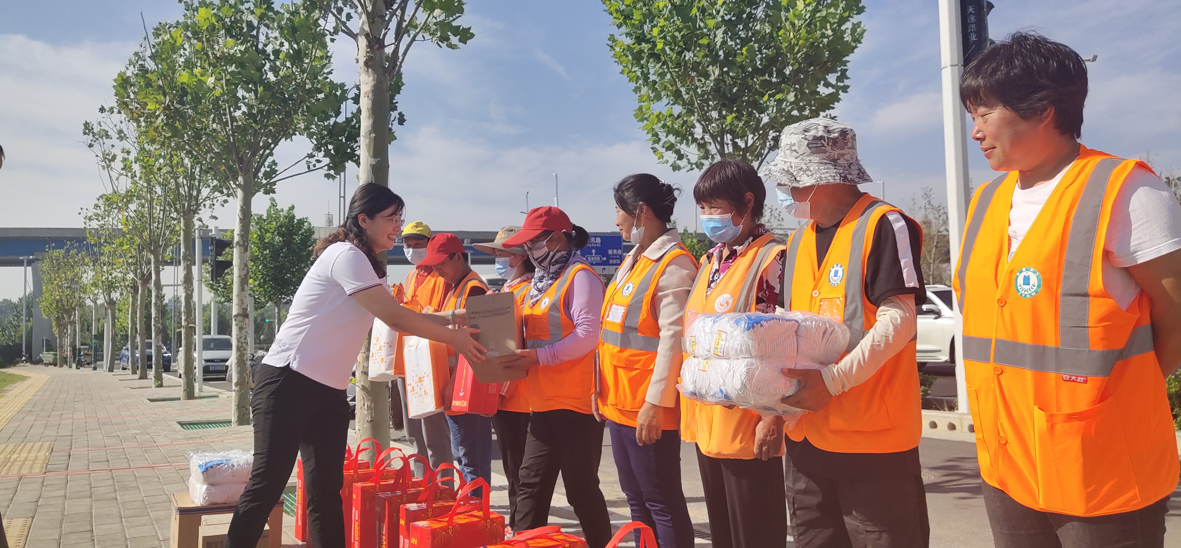 上午9点,在增辉路附近,环卫工人们正在顶着烈日、清理路边脏乱死角。当慰问人员将防暑降温物品送到他们手中时,不少环卫工人脸上露出了朴实的笑容,连声道谢。