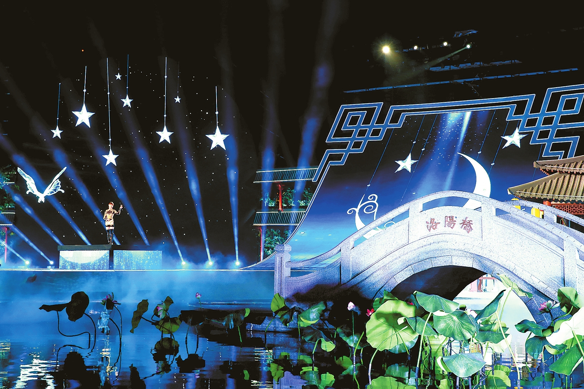 9月17日,2020年中央广播电视总台中秋晚会在洛阳录制。今年中秋晚会的主舞台,以隋唐洛阳城应天门为背景,融入古城深厚的历史文化底蕴,洛阳桥、牡丹等具有洛阳特色的元素点缀其间。本报记者王铮摄