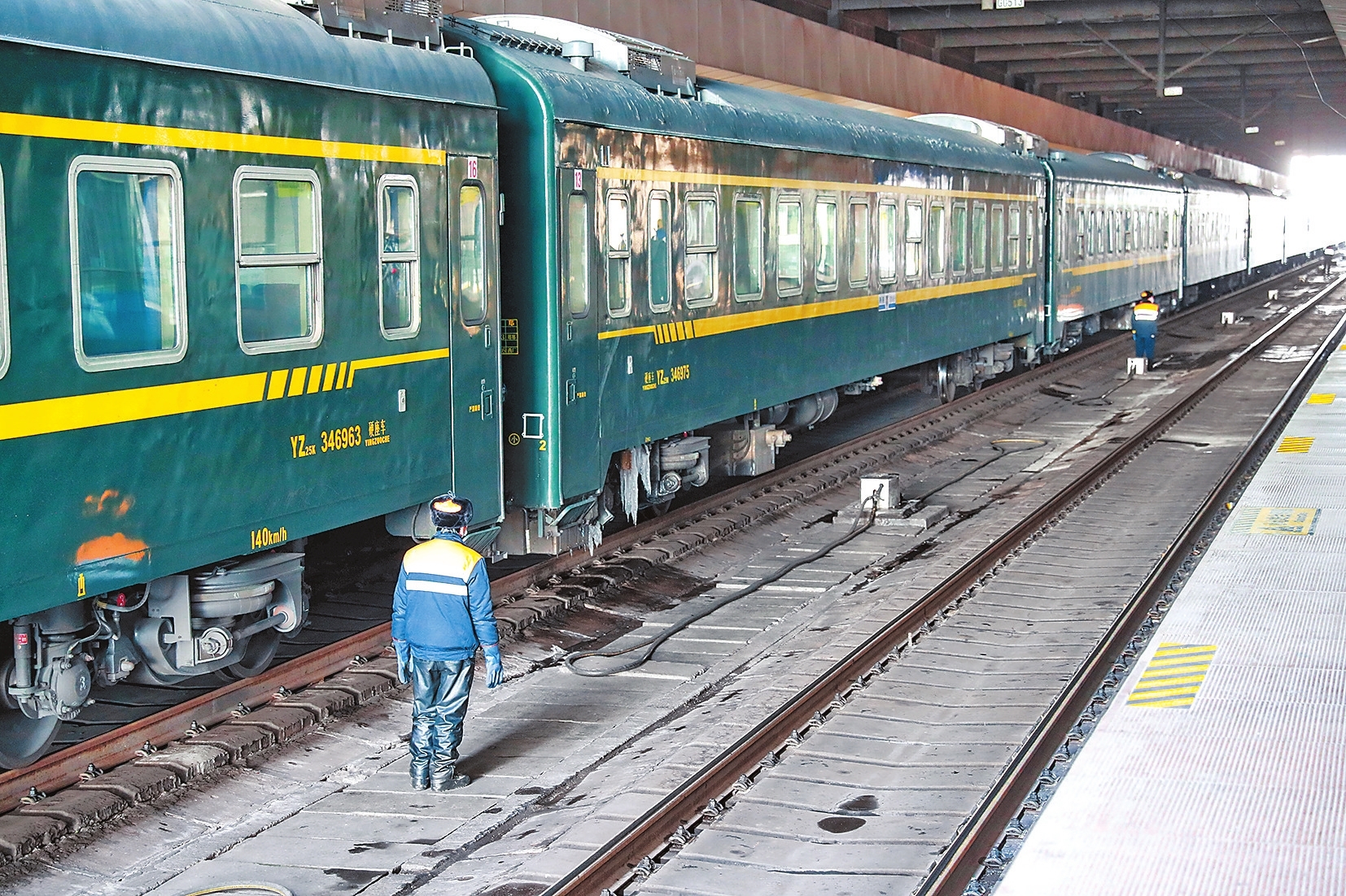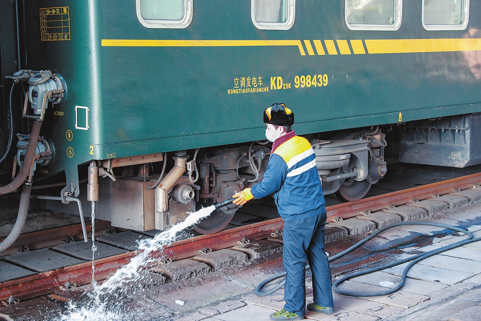 郑州火车站有一个供水车间,加水工每天要24小时工作,为南来北往的列车不停加水,以保障旅途乘客用水需求。12月15日,郑州火车站5名加水工列队站在股道中间,列车刚一停稳,加水工们就快速、熟练地将水管插入车厢的上水接头里。列车虽然在郑州站只停留6分钟,而加水工们只用了4分钟就上满了17节车厢的水。郑州火车站是全国铁路客运“枢纽”,也是重要的列车补水大站,保证行驶列车充足的水,是满足旅客平安、有序、温馨出行的基本保证。