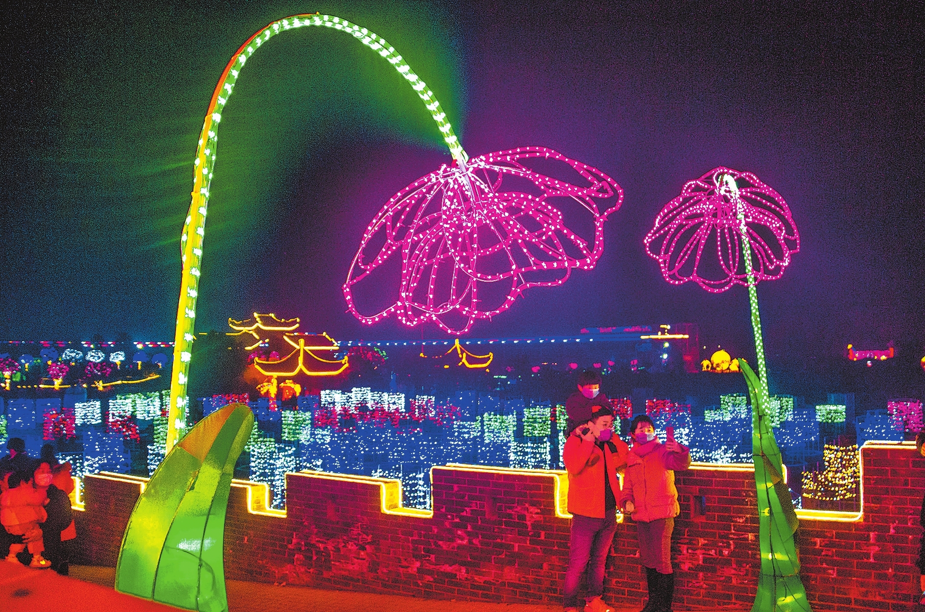 市民在南阳中国月季园内赏灯游玩。高嵩摄