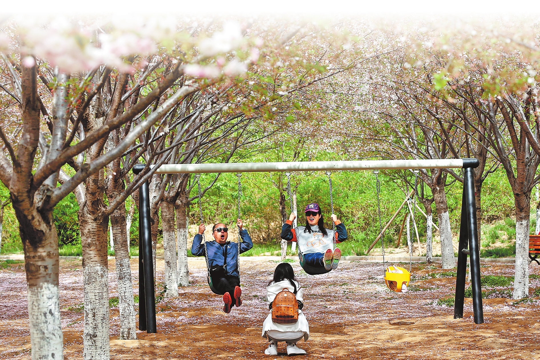 3月30日,游客在黄河岸边的荥阳古柏渡丰乐樱花园游玩。本报记者王铮摄