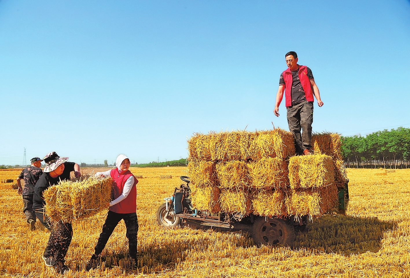 6月5日,宝丰县赵庄镇麦田中,被打成捆的麦秸秆正在装车。王双正摄