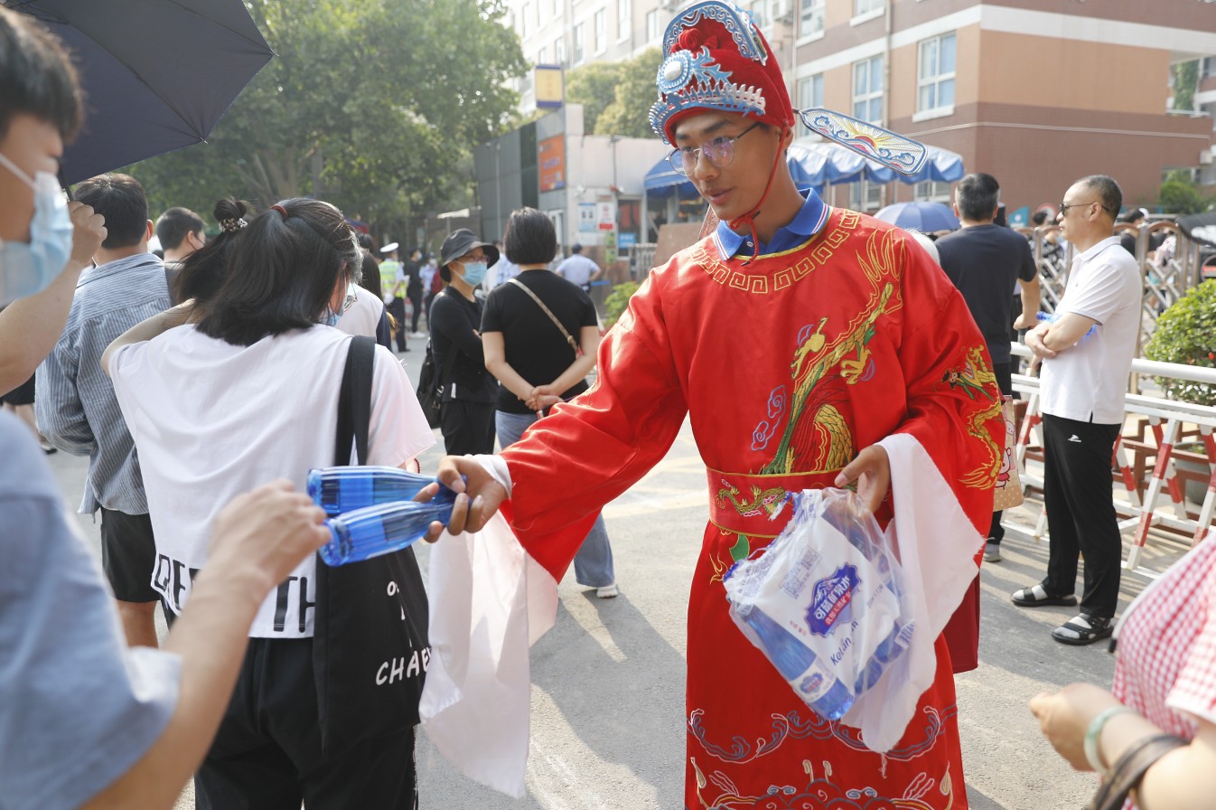 现场有商家打扮成状元模样为步入考场的学生发水