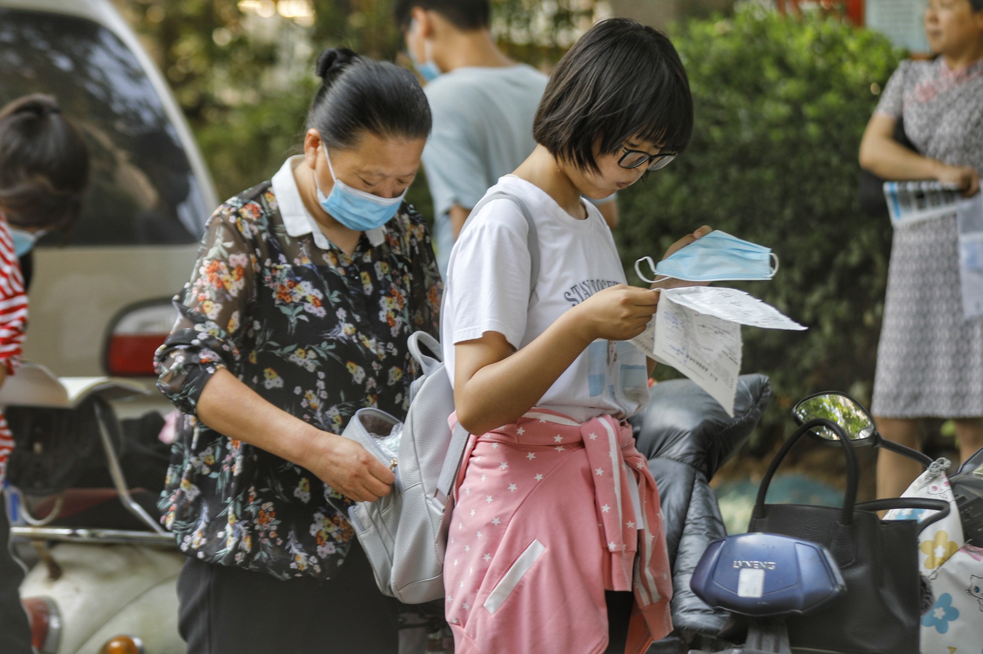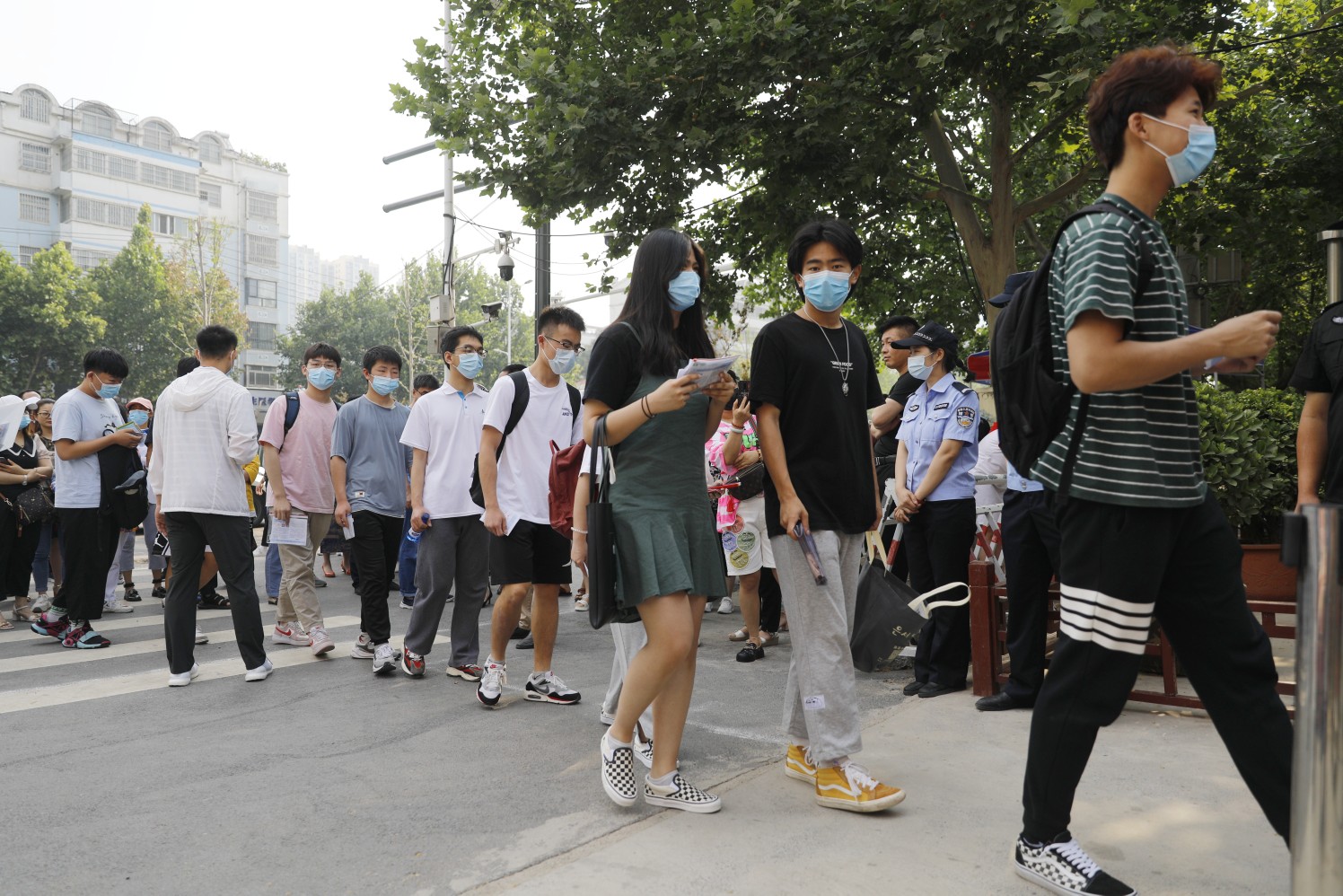 家长在考场外关切地看着孩子步入考场