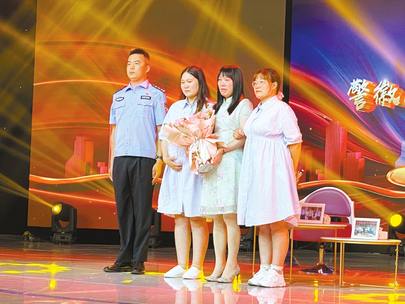 记者注意到,现场双胞胎姐妹穿了同款衣服,双胞胎的妹妹还怀有身孕,3人相互照应,温情场景让人落泪。