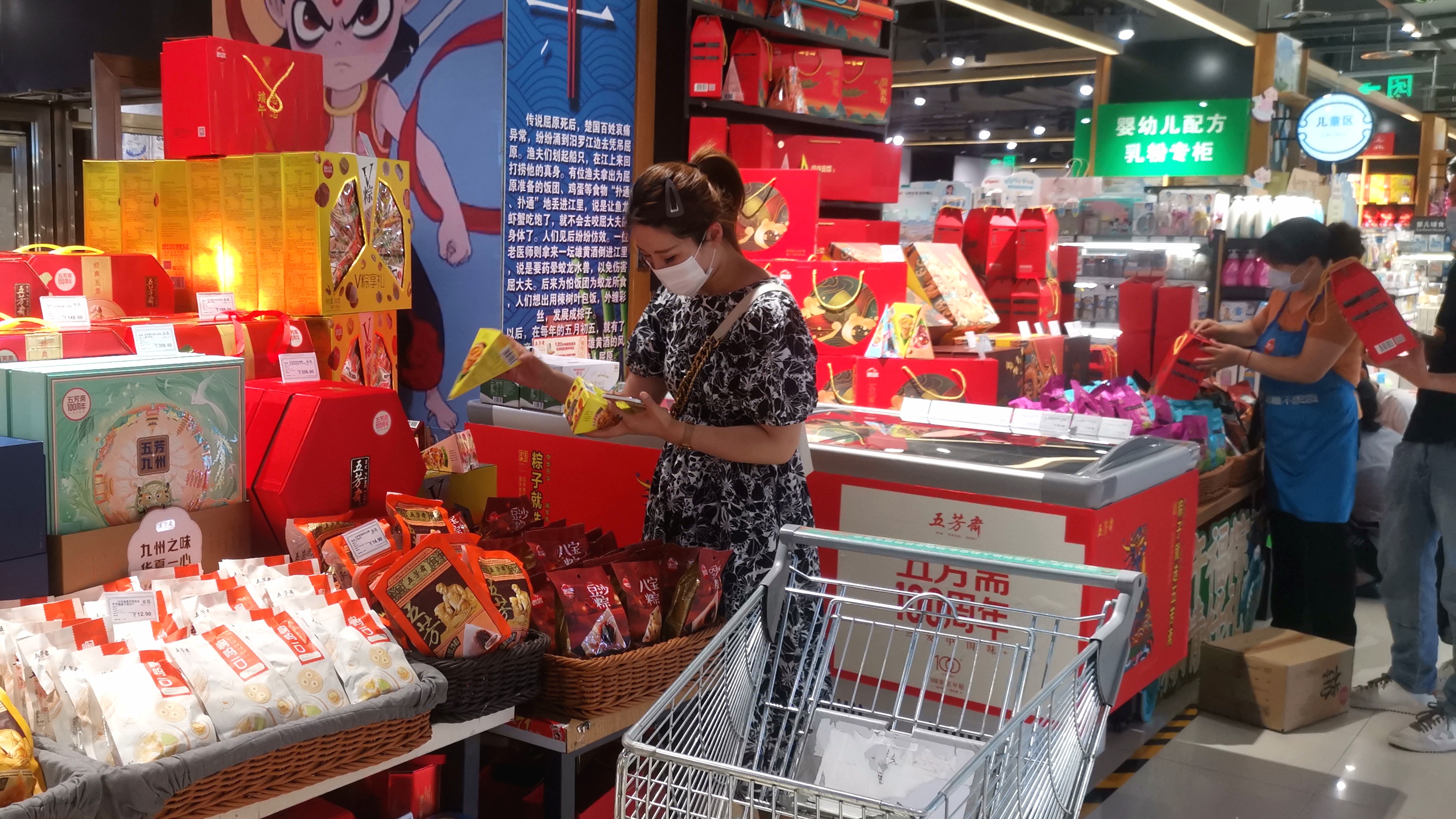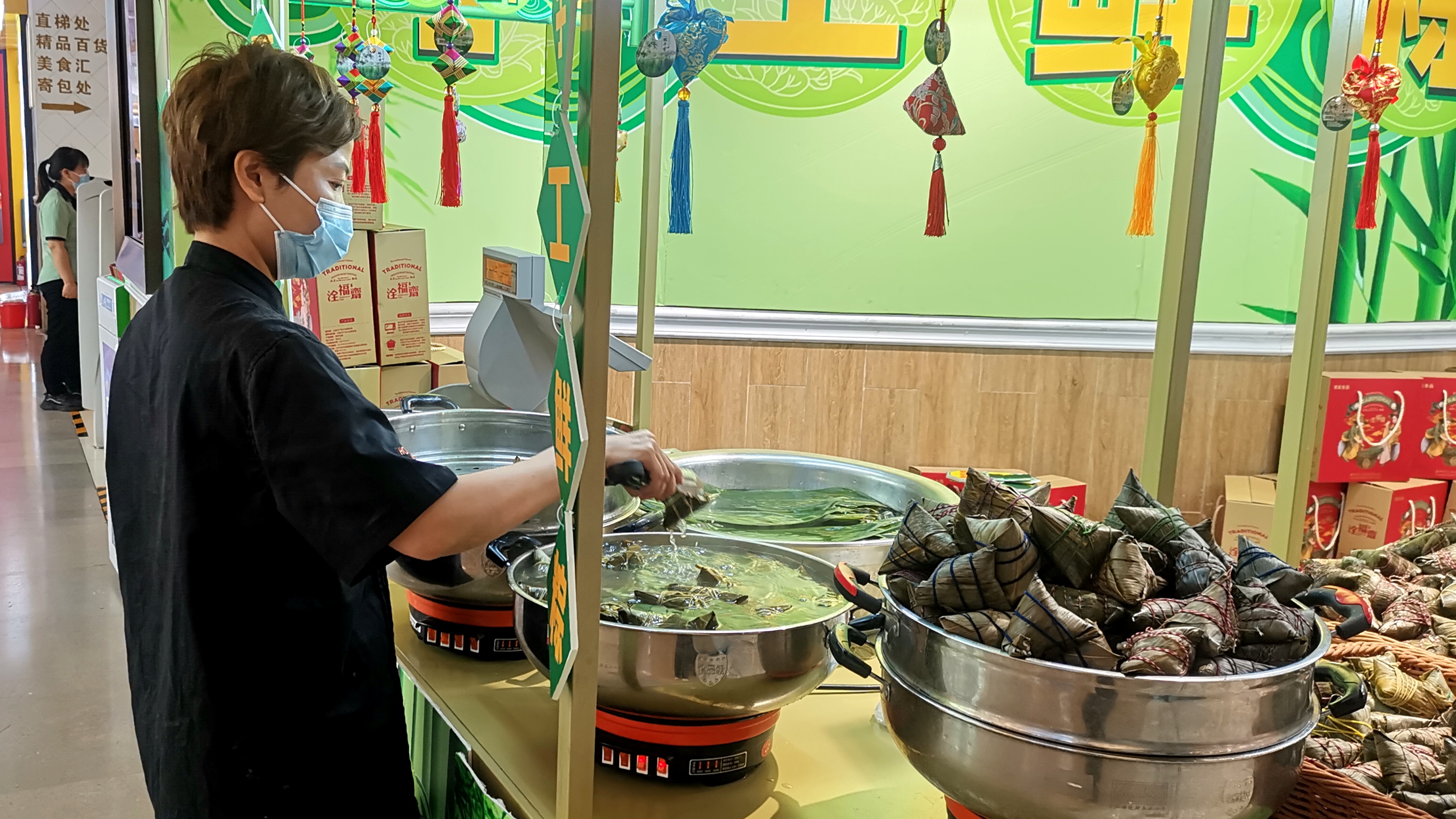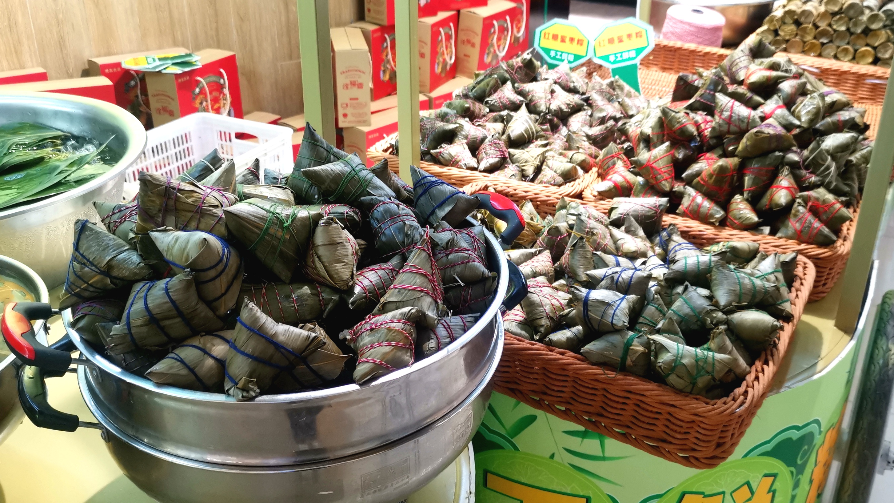 在超市另一个入口处记者还看到了一个卖手工粽子的摊位,刚出锅的粽子冒着热气摆放在架子上,散发着浓浓的香气,令人垂涎欲滴。