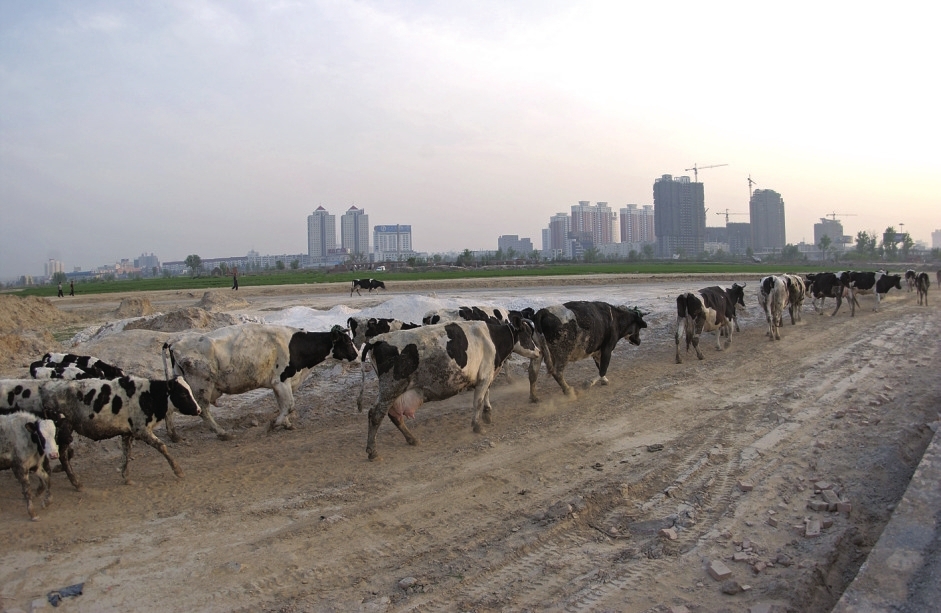 大河网讯·大河报记者白周峰文图 2003年4月16日,在中州大道(当时是107国道)和黄河路交叉口再向东去的方向(现在是黄河东路),一排奶牛正在这里穿过。也是在这个位置,几名施工工人正在安装黄河东路路面的地砖,同时,黄河东路的路面也在施工当中。