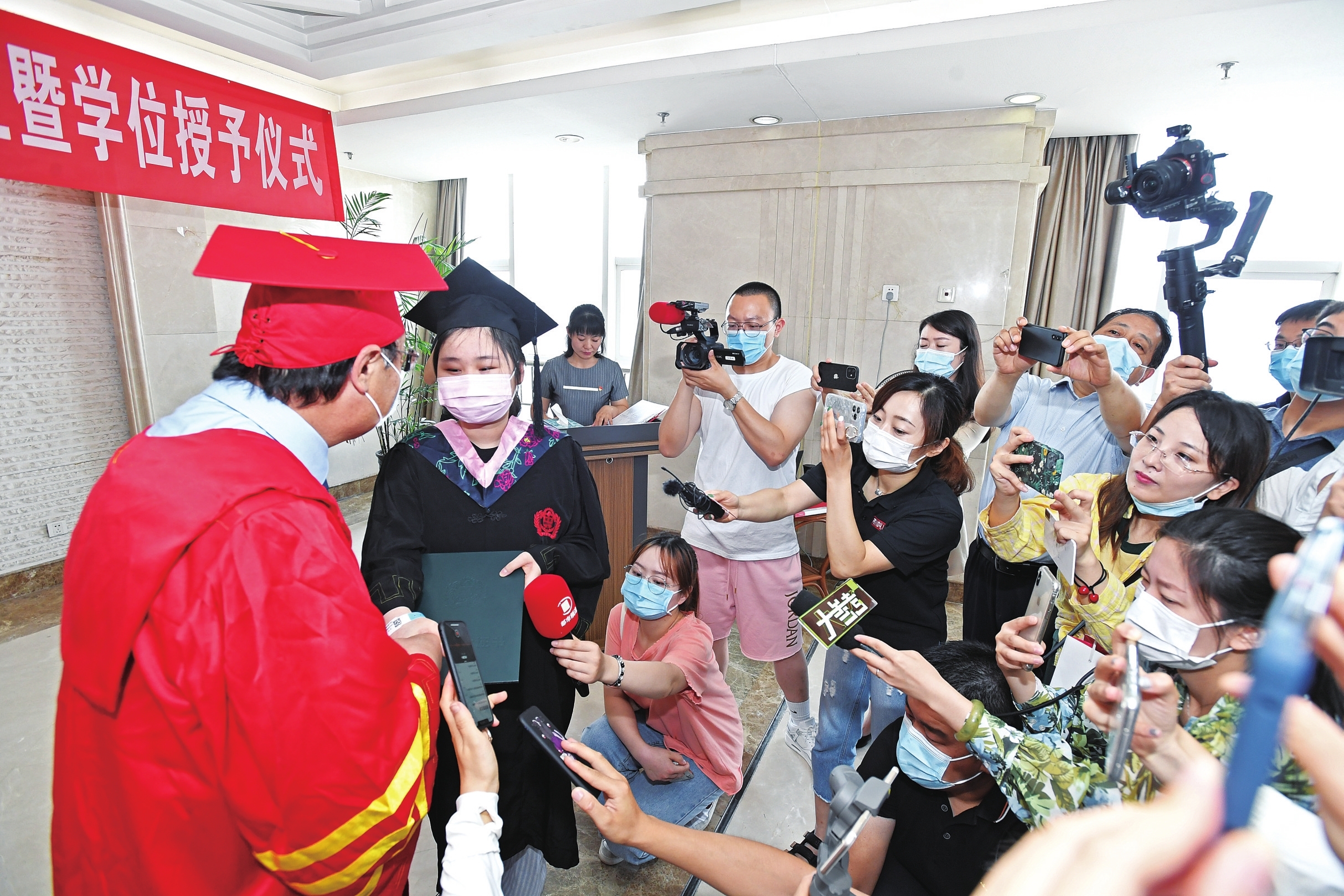 “孙莹同学,恭喜你完成大学课程,顺利毕业。”2021年6月23日上午,一场一个人的毕业典礼在河南省肿瘤医院10号病房楼27层阳光房里进行。