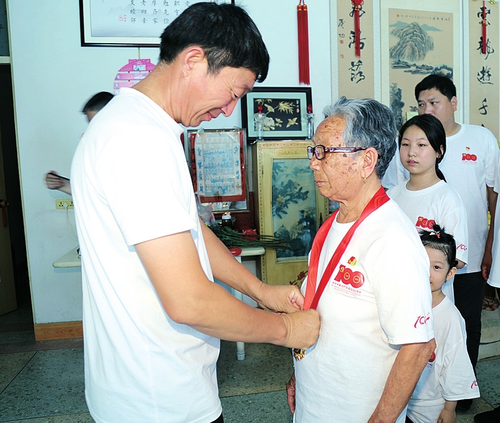 “没有党的英明、正确领导,就没有我们现在衣食无忧的幸福生活。这枚金光闪闪的纪念章,是对我人生最大的鞭策和鼓舞。感谢党对我们老党员的关怀!”