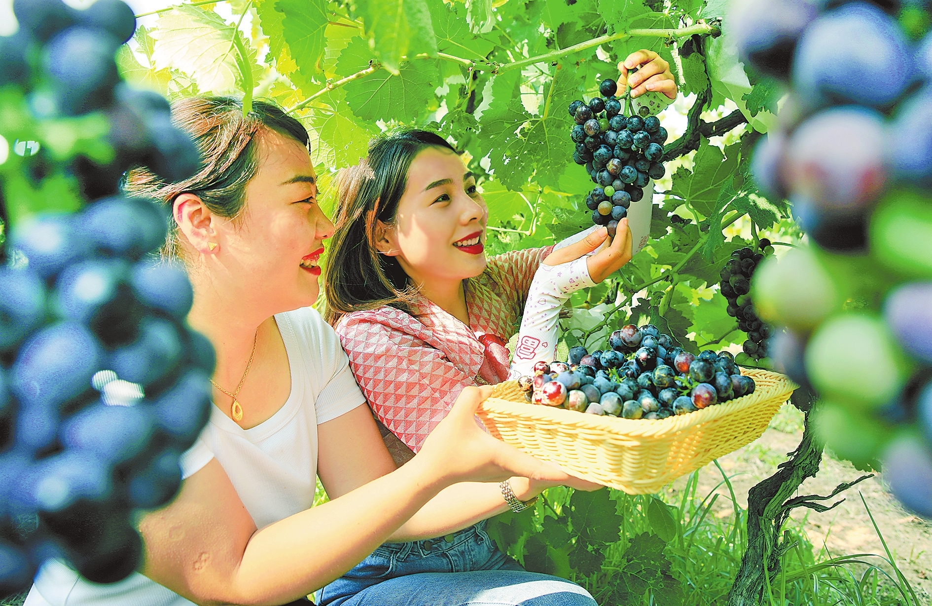 7月12日,尉氏县岗李乡独楼马村的村民在本村的农业产业园采摘葡萄。近年来,该县采取“党支部+基地+农户”的模式大力发展现代特色农业,他们主动对接电商和网络平台,通过网络直播、体验式采摘等方式,力促当地群众增收致富。李新义摄