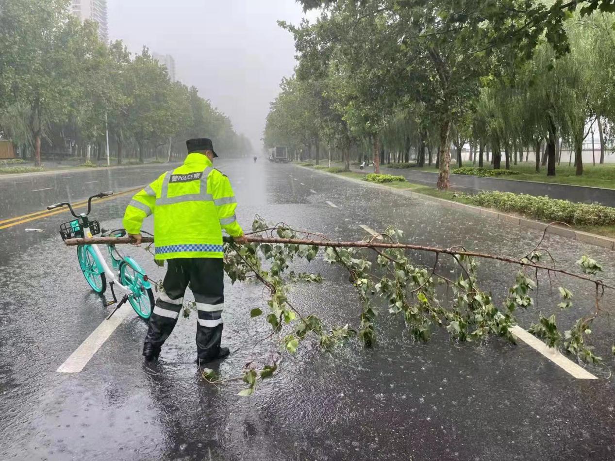 22日15时30分,在绿源路江山路段积水点,郑州市公安局惠济分局民警清理路面障碍,提醒过往车辆及行人绕行。
