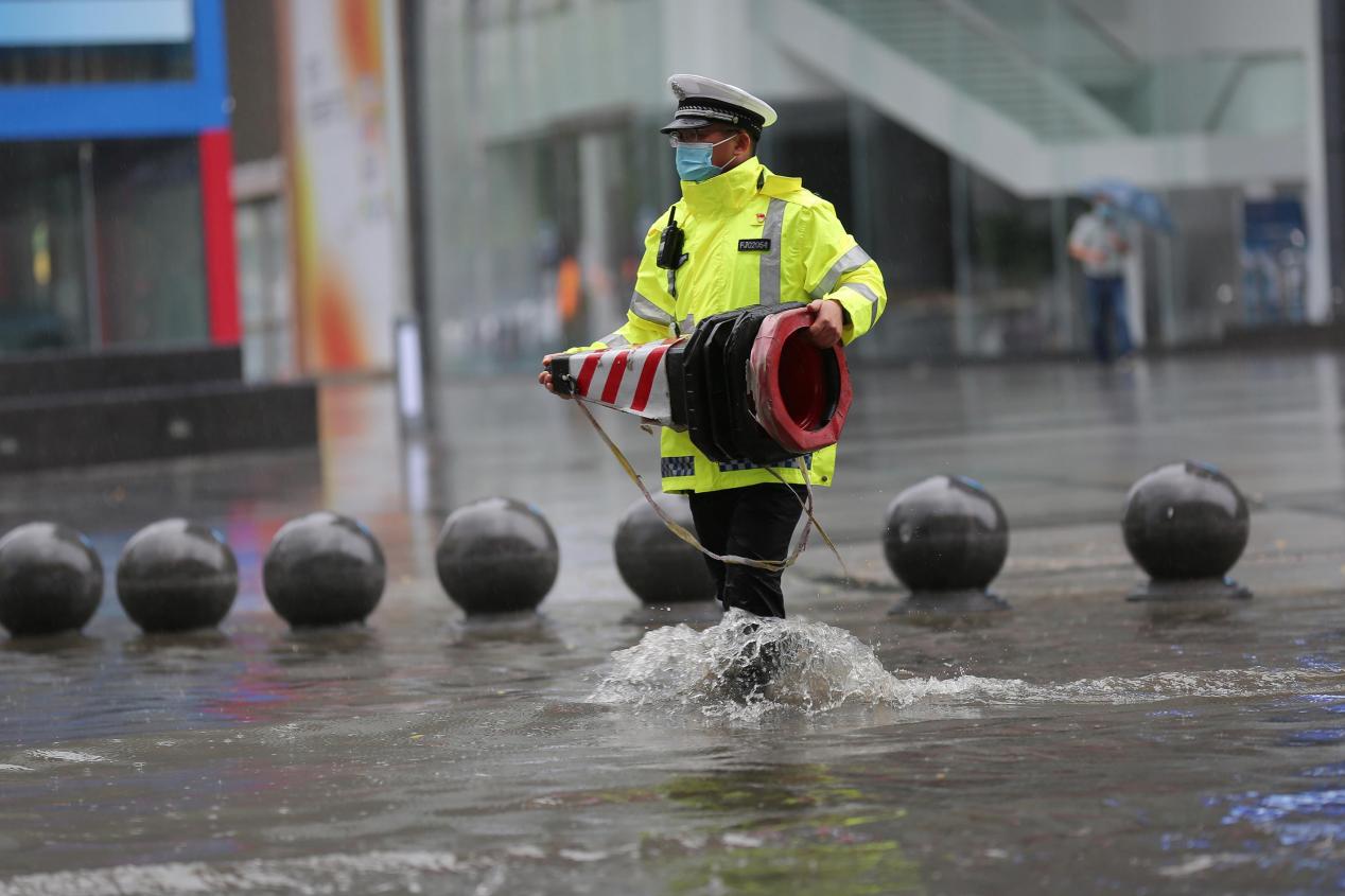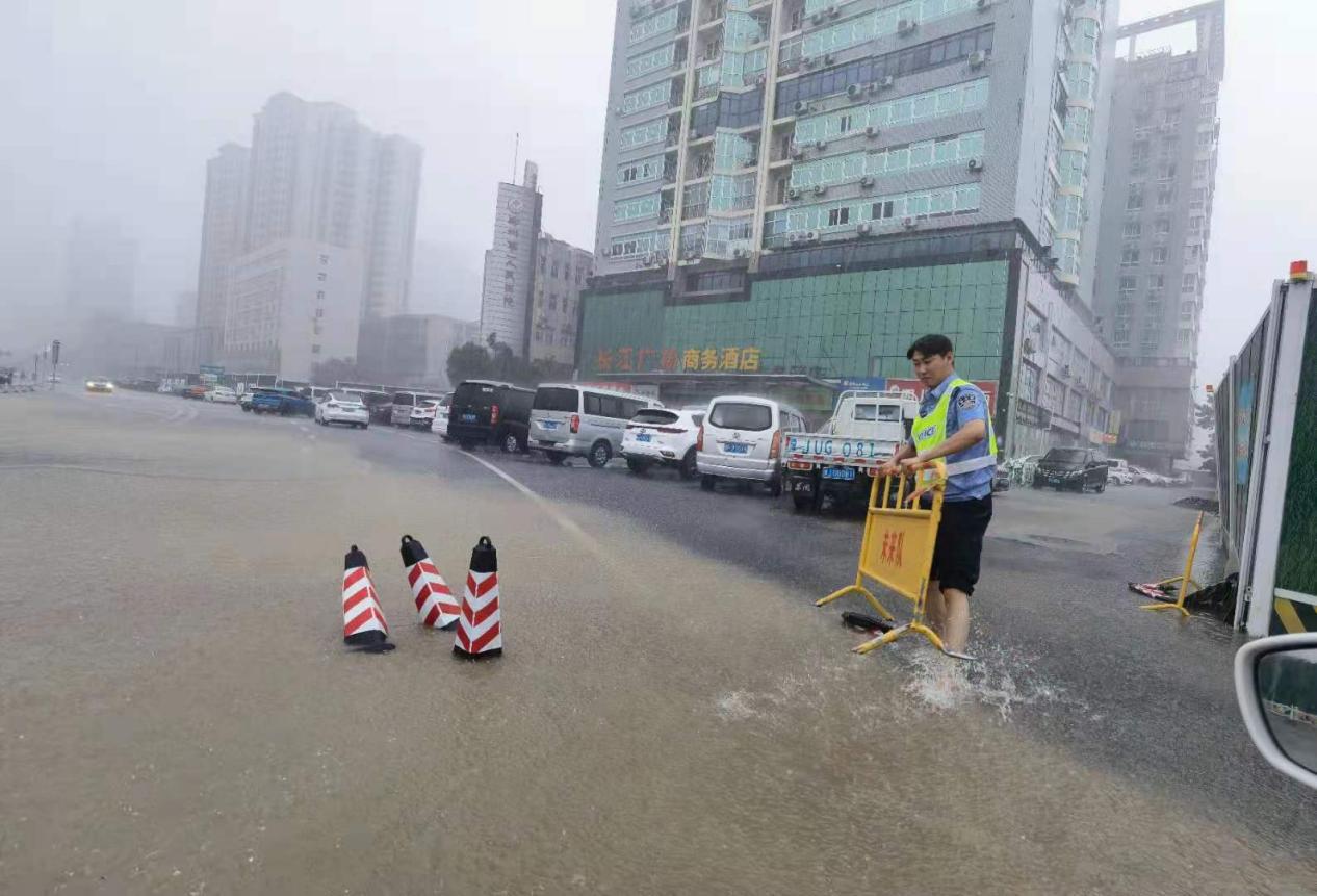 22日14时,郑州市公安局管城分局执勤民警冒雨在紫荆山路东大街附近积水点设置警示牌,确保人员车辆安全通行。