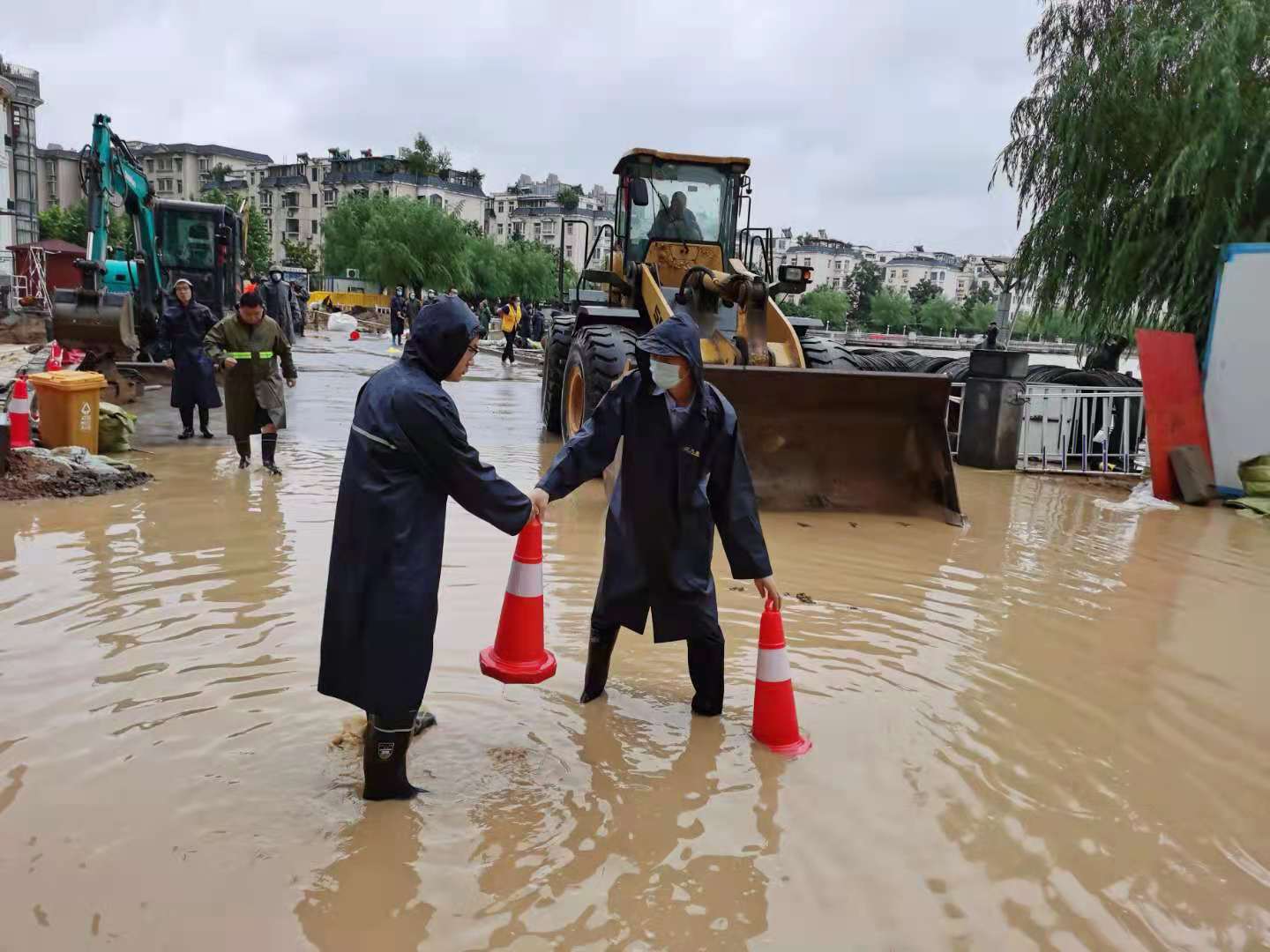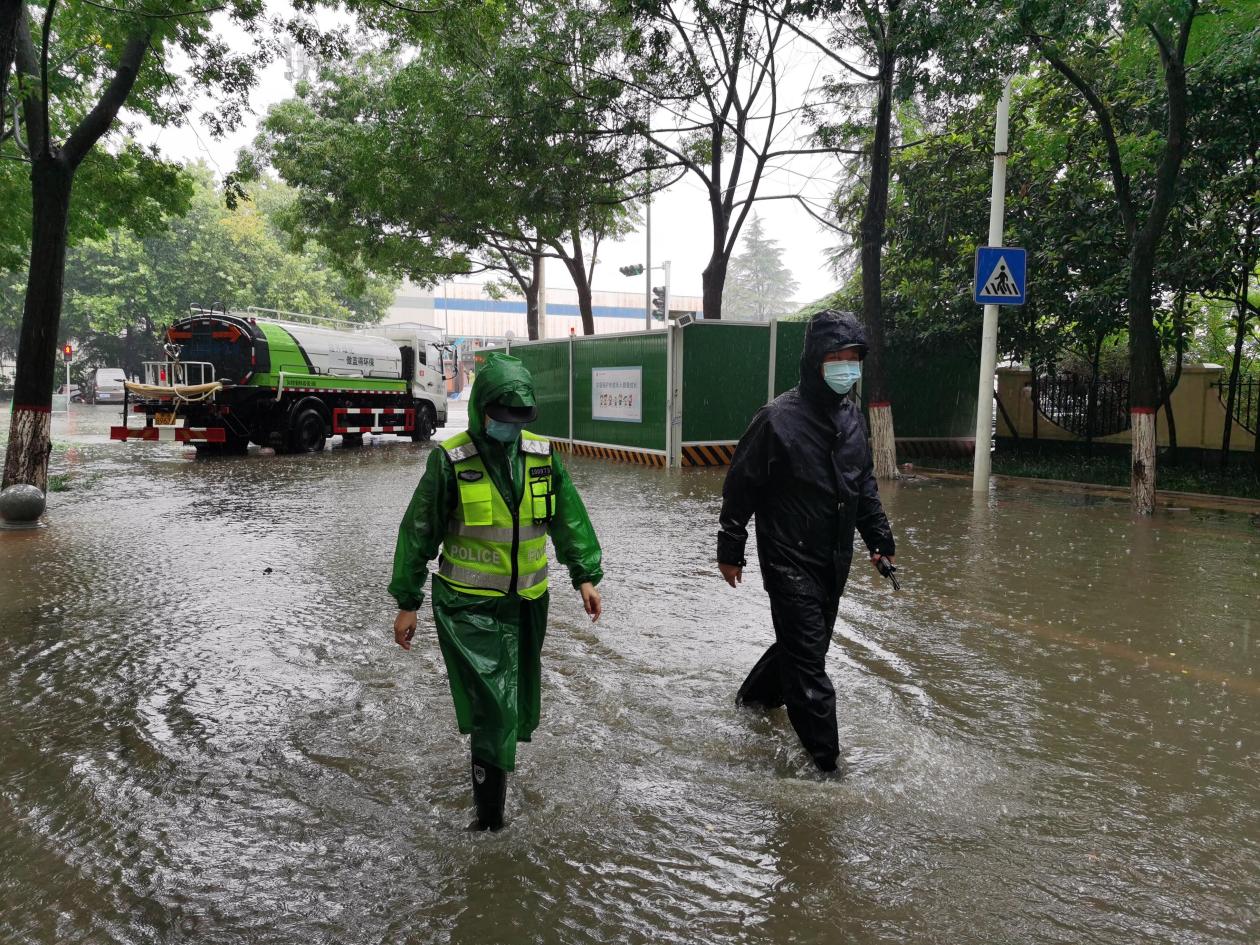郑州市公安局经开分局明湖派出所民警深入辖区居民小区查看积水情况。