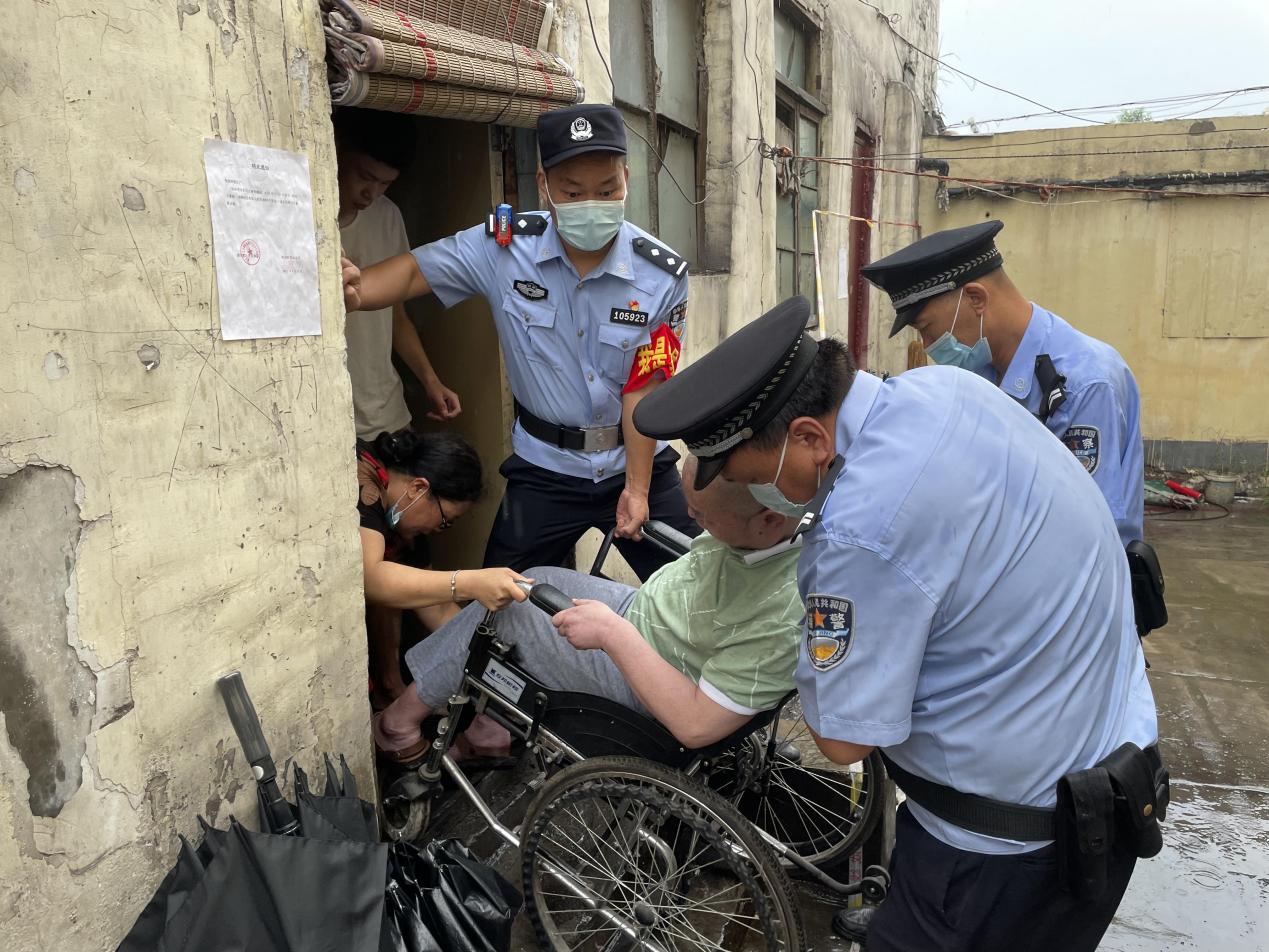 郑州市公安局新密市局西街派出所民警转移安置受灾群众。