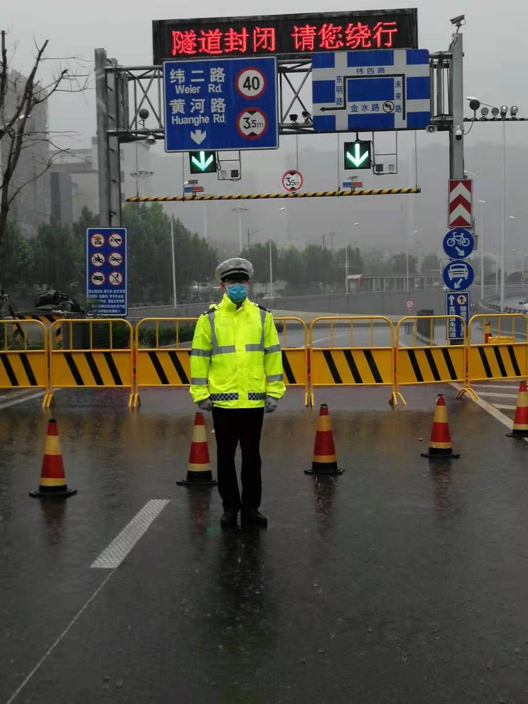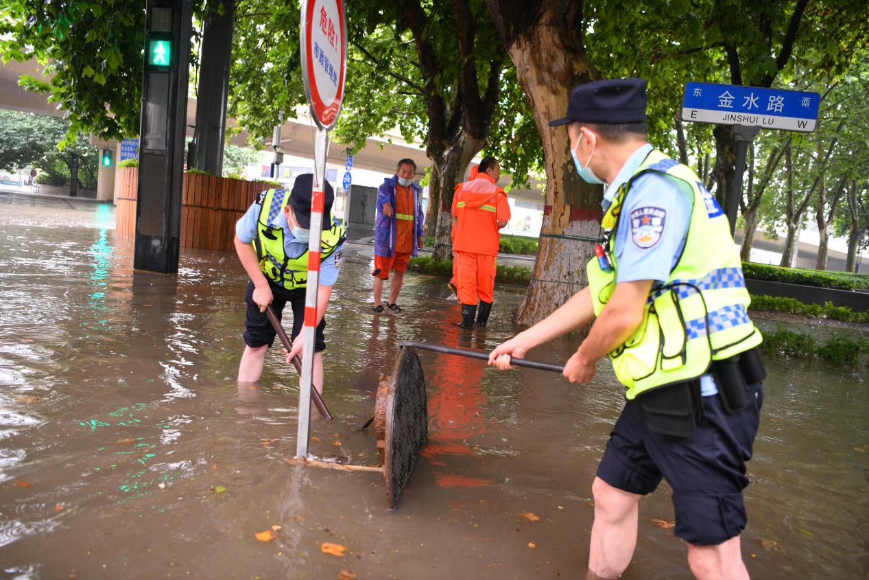 郑州市公安局金水分局民警清理金水路紫荆山路立交桥下积水点排水口,并设置警示标志。