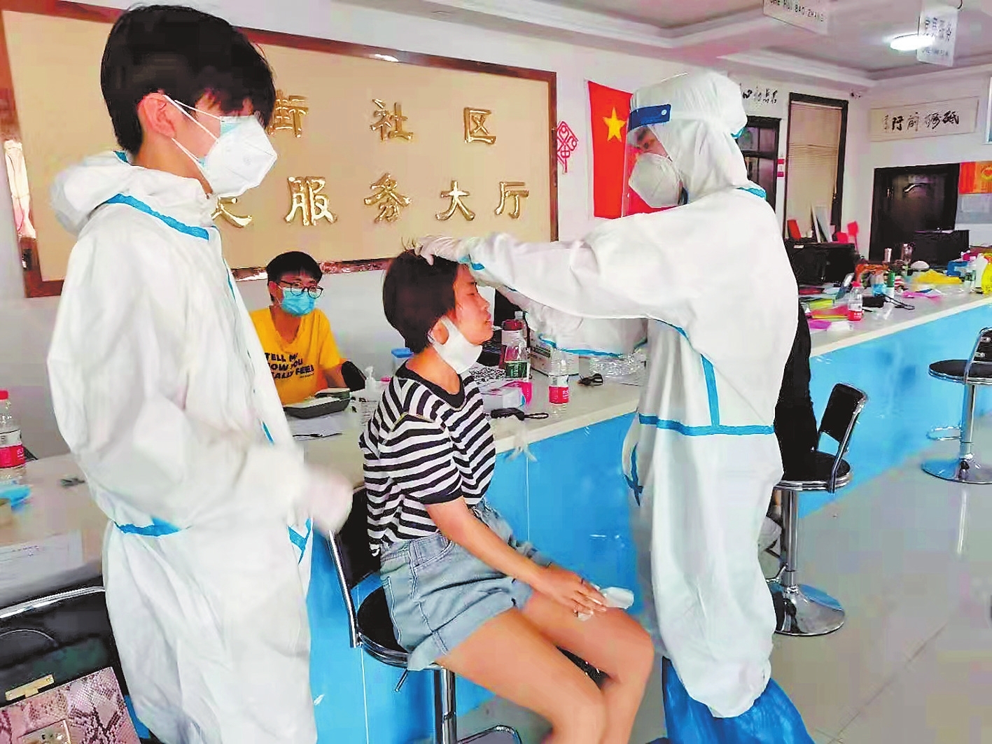 “在核酸检测现场,我们俩人的主要任务,一是维持现场秩序,避免人群交叉感染,二是帮助老年人或者不会操作手机的人,完成核酸检测。”哥哥谷泓易说。