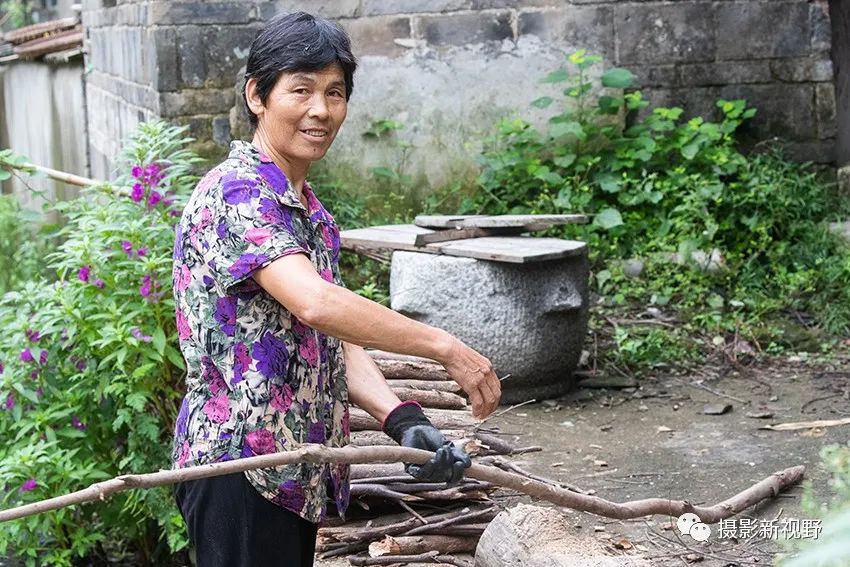 这位大嫂在整柴禾,墙边放着一个打糍粑的石臼。