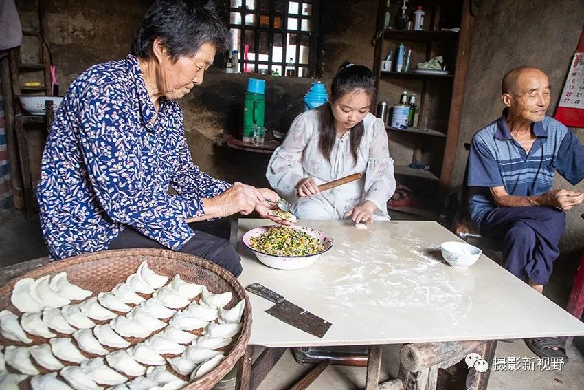 这位在外上大学的女学生暑期回到家乡,和奶奶一起包饺子。