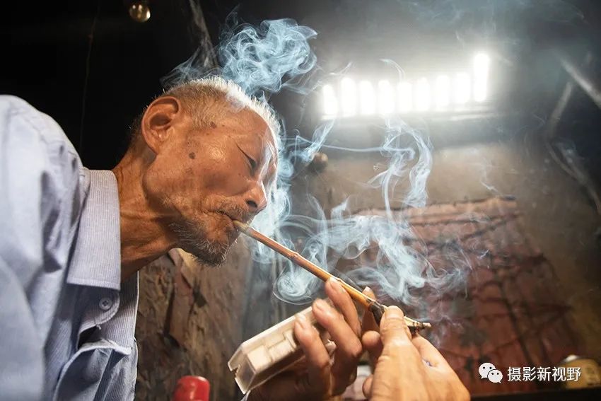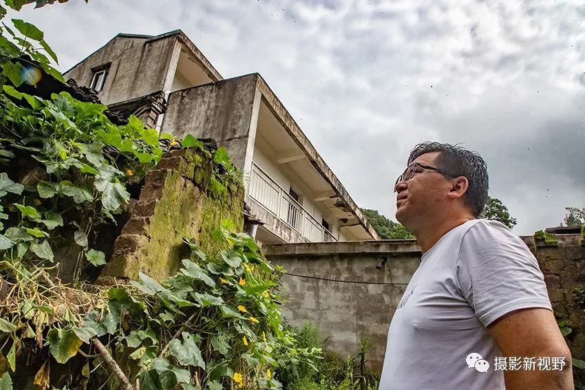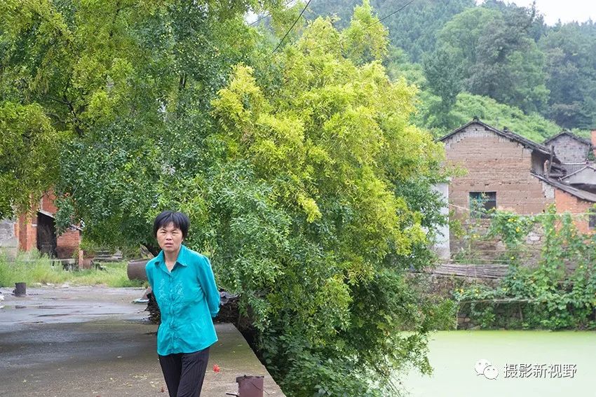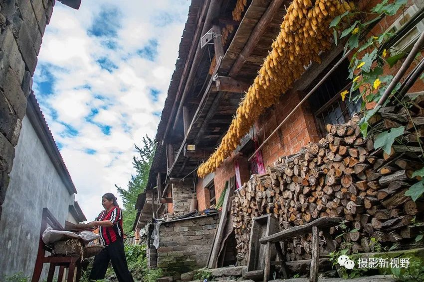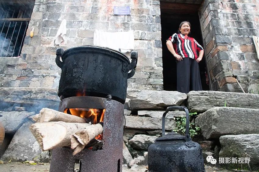 这是老叶湾村内一座百年老房子,村妇在屋门口用柴炉烧水。